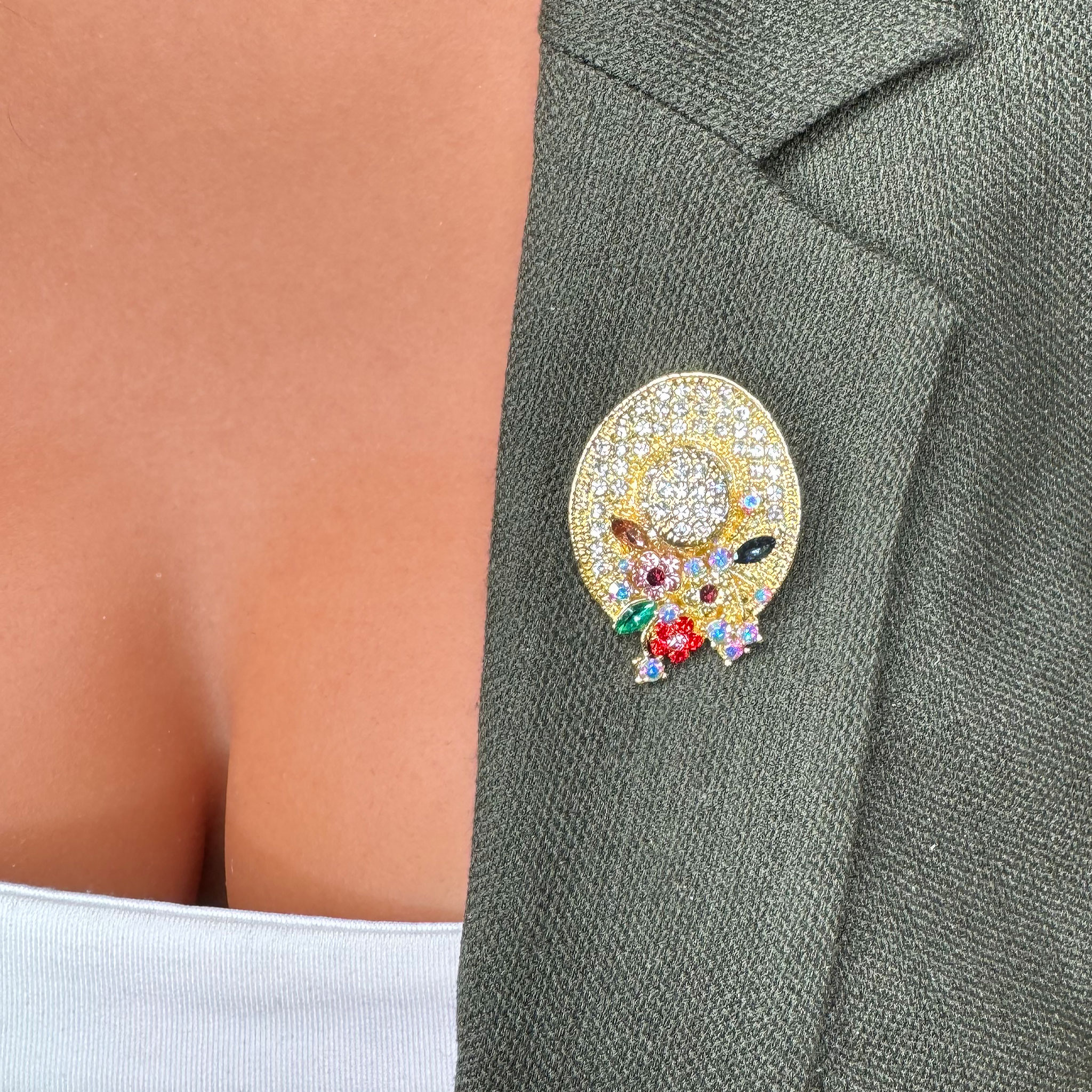Această broșă surprinde eleganța și delicatețea printr-o pălărie aurie împodobită cu floricele. Culoarea aurie evocă luminozitate, optimism și rafinament, în timp ce floricelele adaugă prospețime și gingășie. Este un accesoriu care aduce farmec și personalitate fiecărei ținute, inspirând feminitate și energie pozitivă.