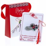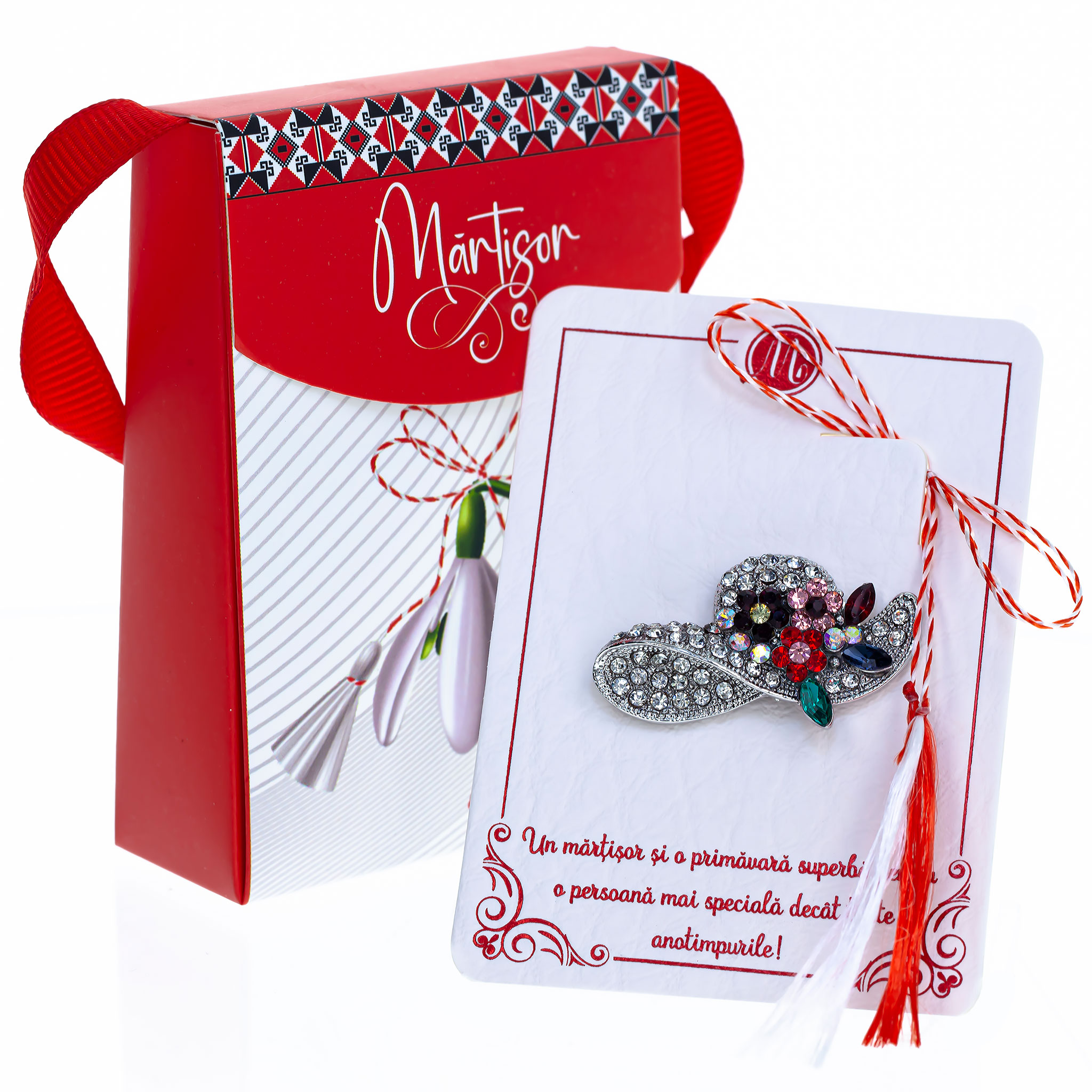 - Broșă Mărțișor Gentuță Pălărie Elegantă, șnur Marțișor alb-roșu, ambalată în cutie tip gentuță, pregătită cu grijă pentru a fi oferită drept simbol al tradiției și al frumuseții primăverii.