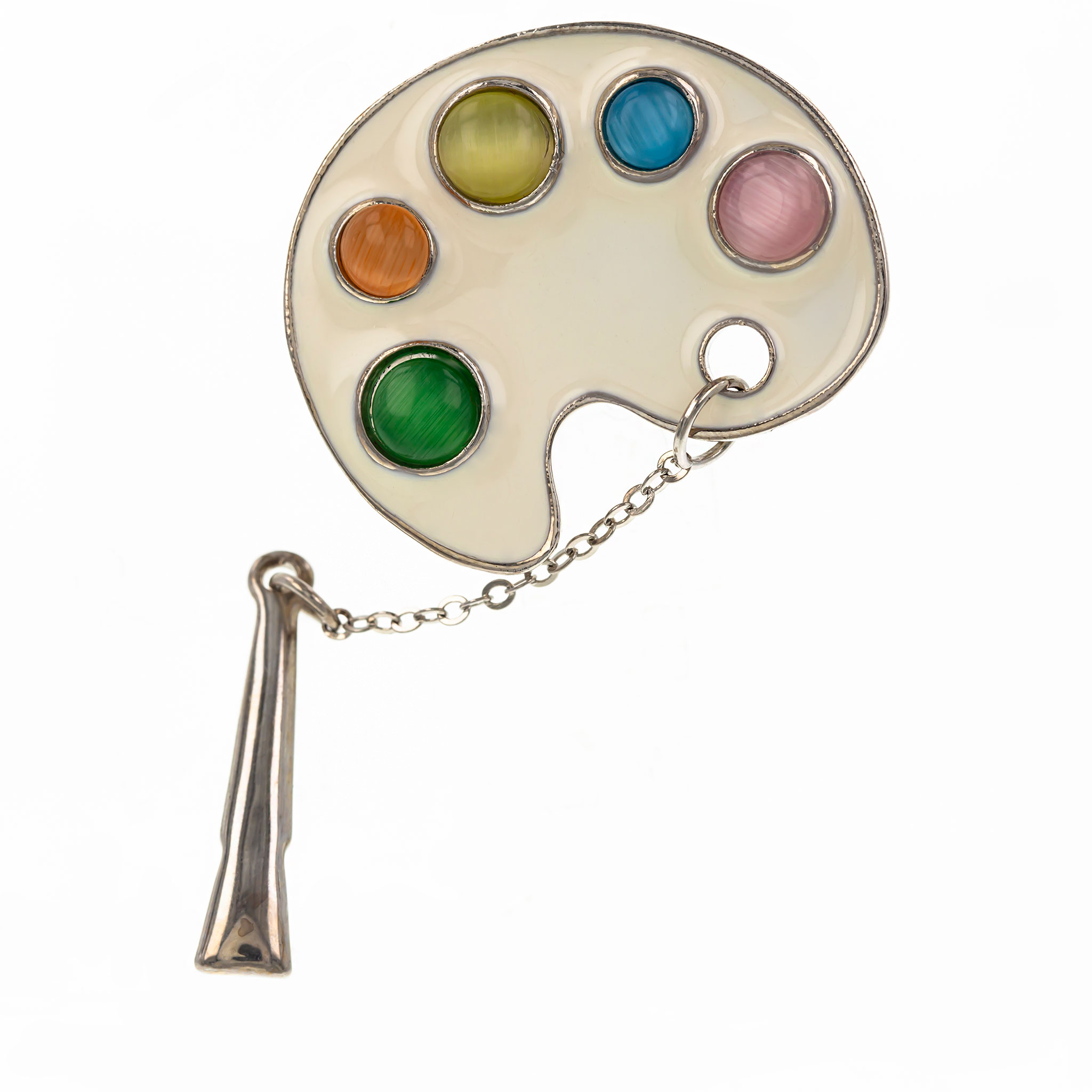 - Design: Această broșă impresionează prin paleta variată de culori și prin contururile delicate. Fiecare culoare reprezentată pe paletă adaugă un plus de vitalitate și expresivitate întregii bijuterii. Forma paletei permite o interpretare artistică, iar dimensiunile moderate fac ca această broșă să fie ușor de purtat.