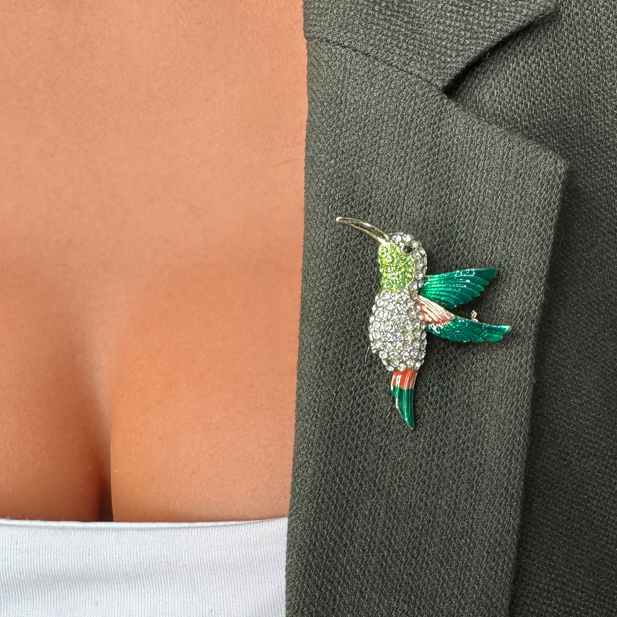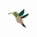Broșa în formă de pasăre colibri cu aripioare verzi, decorată cu pietricele strălucitoare, emană o combinație de prospețime și strălucire. Aripioarele verzi adaugă o notă de natură și vitalitate, evidențiind caracteristicile păsarii colibri, iar pietrele strălucitoare aduc un strop de eleganță și strălucire.