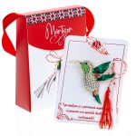 - Broșă Mărțișor Gentuță Pasărea Colibri cu Aripioare Verzi, șnur Marțișor alb-roșu, ambalată în cutie tip gentuță, pregătită cu grijă pentru a fi oferită drept simbol al tradiției și al frumuseții primăverii.