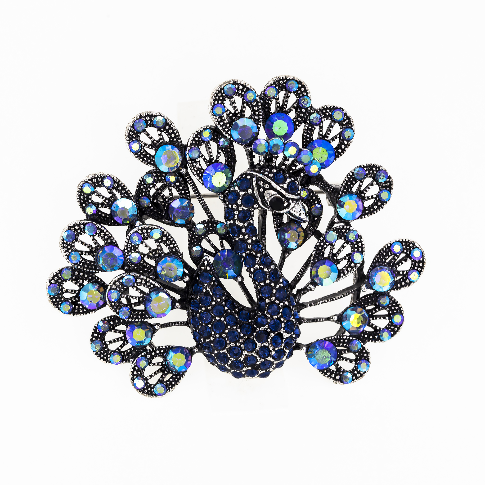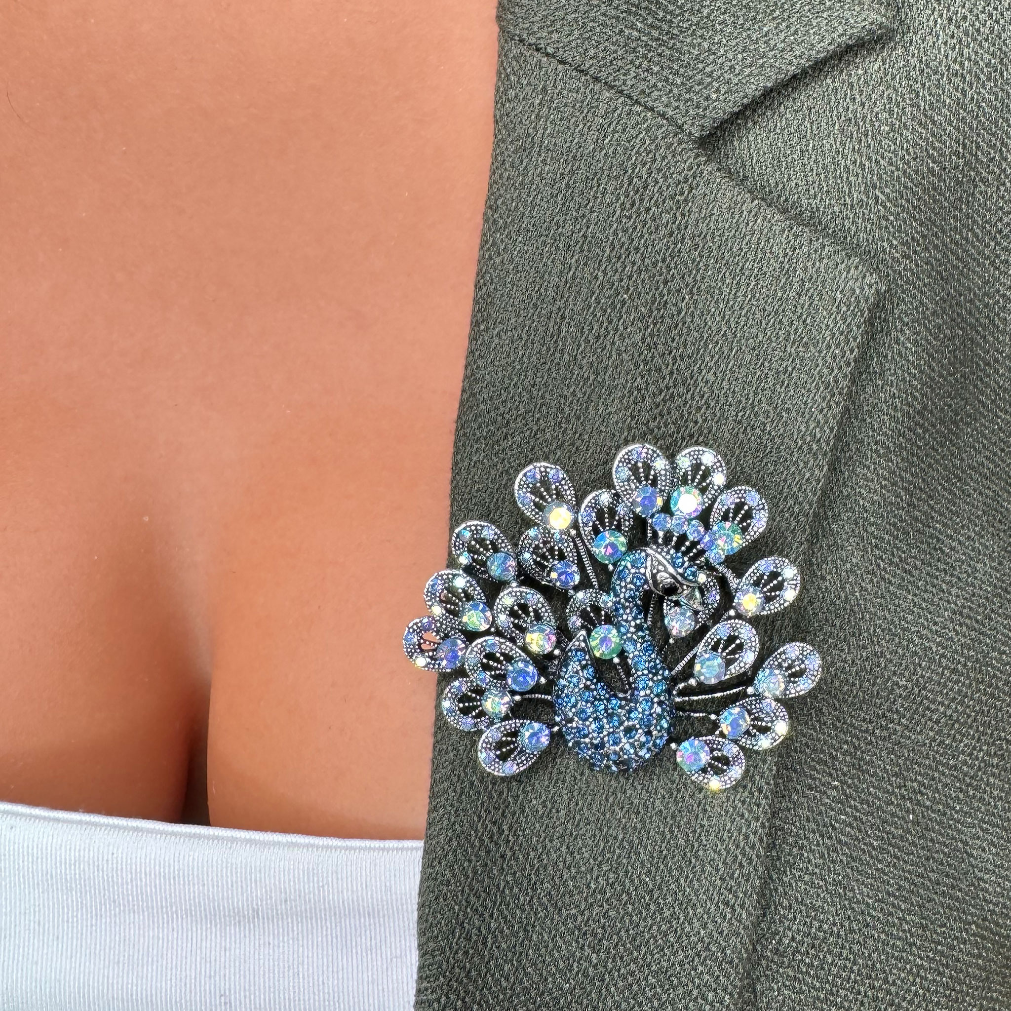 - Design: Broșa este realizată sub forma unui păun regal, cu coadă amplă decorată cu pietricele albastre, care captează lumina subtil și oferă un efect vizual elegant.