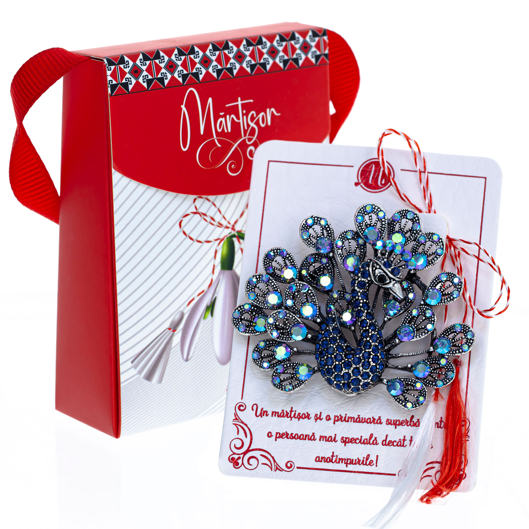 - Broșă Mărțișor Gentuță Păun Regal cu Pietricele Albastre, șnur Marțișor alb-roșu, ambalată în cutie tip gentuță, pregătită cu grijă pentru a fi oferită drept simbol al tradiției și al frumuseții primăverii.