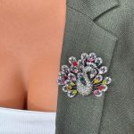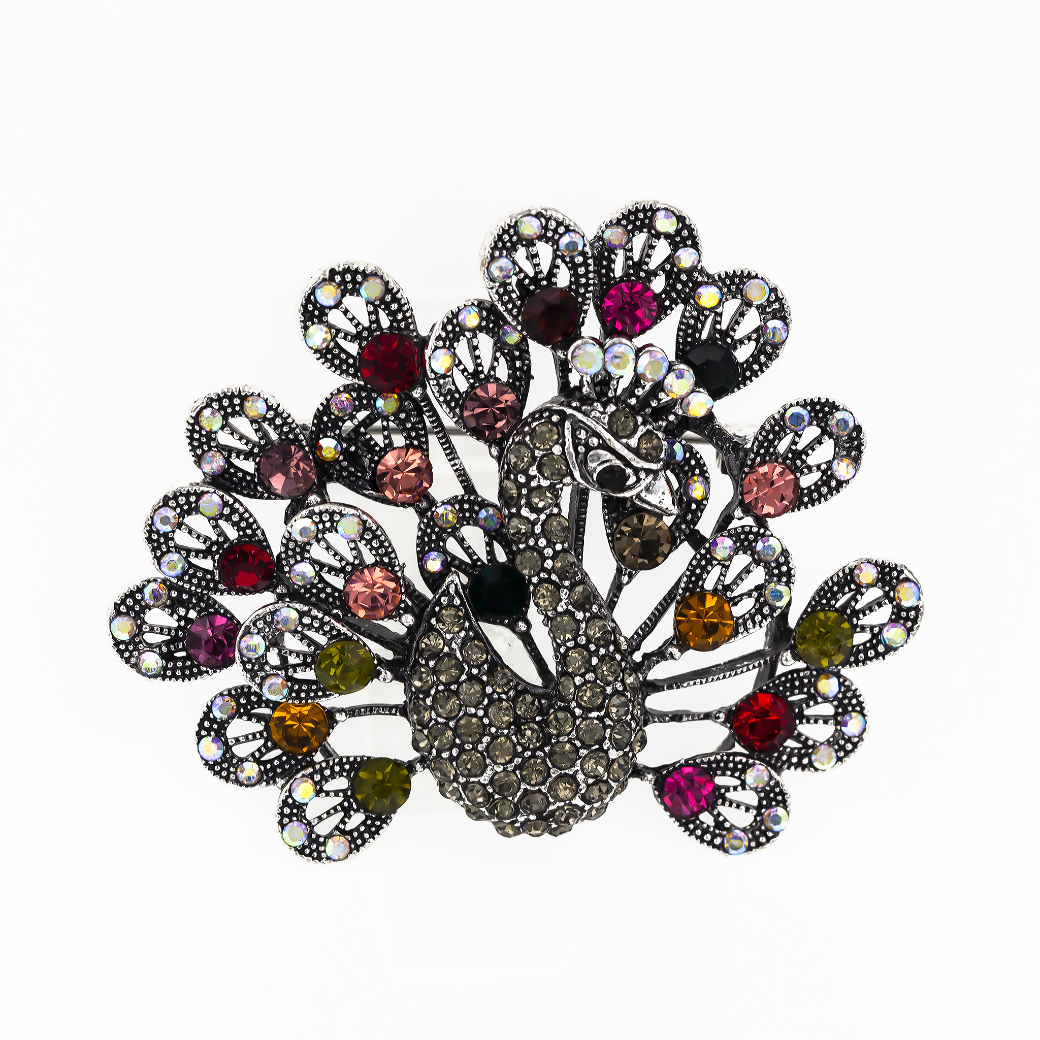 - Design: Broșa este realizată sub forma unui păun stilizat, cu coadă amplă decorată cu pietricele multicolore care îi conferă un aspect vibrant și elegant. Detaliile fine îi oferă un efect vizual deosebit și captivant.