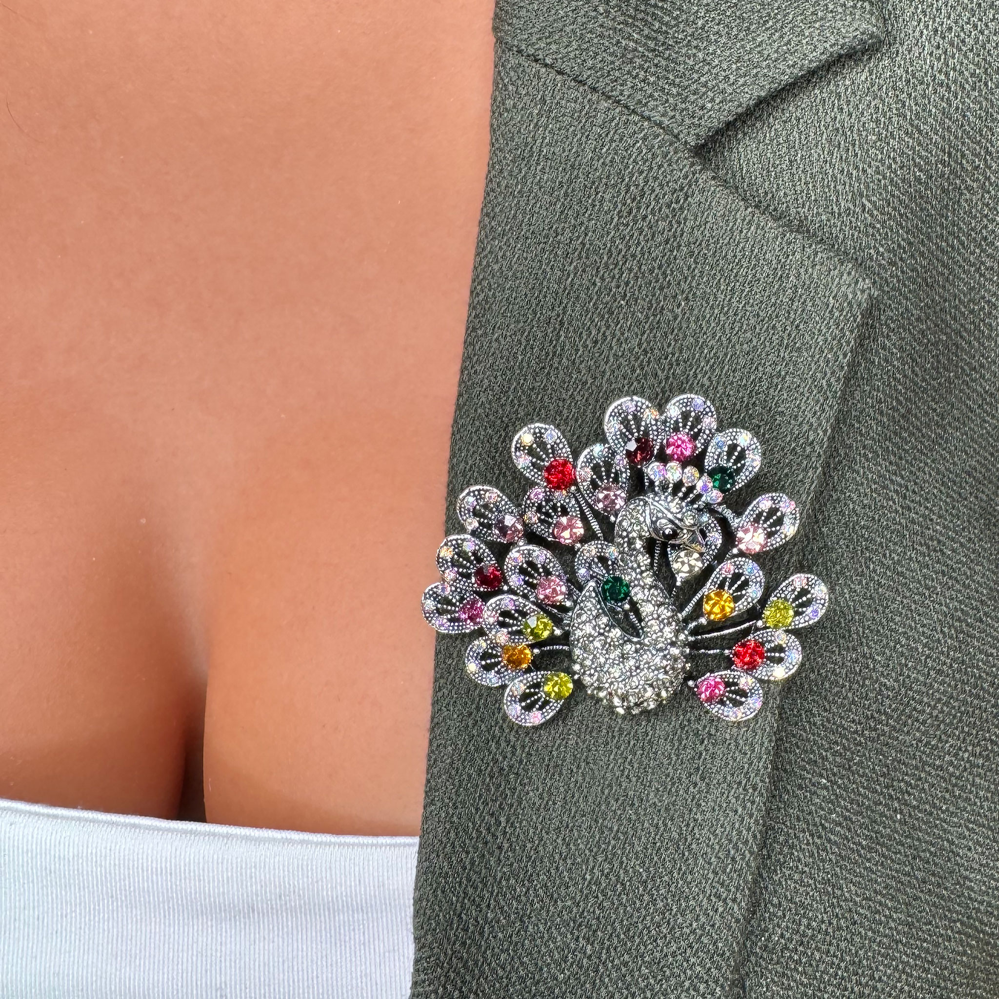 Această broșă surprinde măreția și frumusețea păunului, simbol al eleganței și al nobleței. Pietricelele multicolore adaugă un strop de magie și rafinament, reflectând lumina în mod spectaculos. Este o bijuterie care transmite strălucire, grație și bucuria de a purta un accesoriu cu personalitate și expresivitate artistică.
