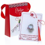 - Broșă Mărțișor Gentuță Pisicuță Argintie cu Coroniță, șnur Marțișor alb-roșu, ambalată în cutie tip gentuță, pregătită cu grijă pentru a fi oferită ca un cadou special, simbol al tradiției.