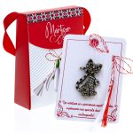 - Broșă Mărțișor Gentuță Pisicuță cu Floricică, șnur Marțișor alb-roșu, ambalată în cutie tip gentuță, pregătită cu grijă pentru a fi oferită drept simbol al tradiției și al frumuseții primăverii.
