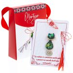 - Broșă Mărțișor Gentuță Pisicuță cu Fundiță, șnur Marțișor alb-roșu, ambalată în cutie tip gentuță, pregătită cu grijă pentru a fi oferită drept simbol al tradiției și al frumuseții primăverii.