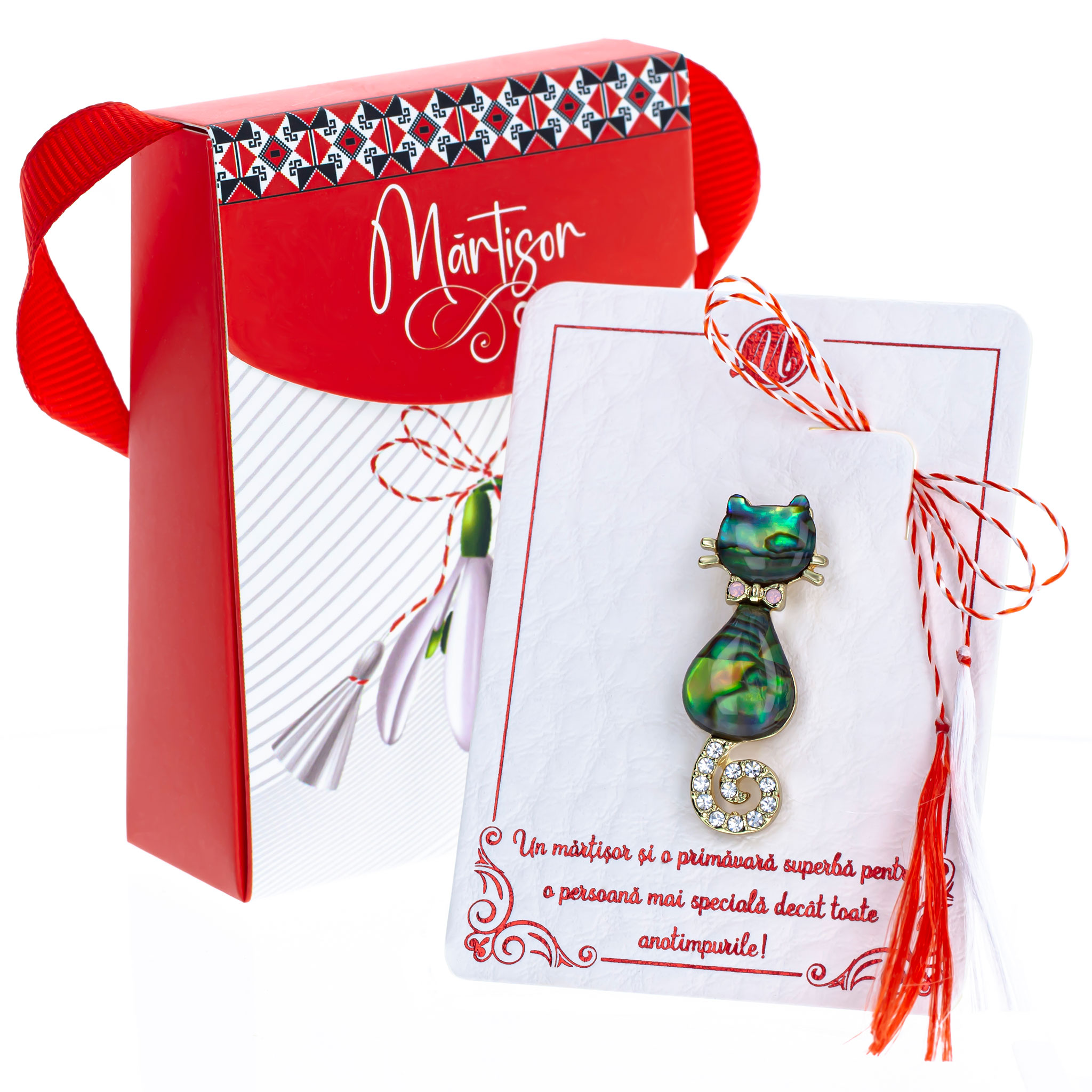 - Pisicuța este adesea asociată cu simbolurile curiozității și ale protecției. În contextul Mărțișorului, broșa în formă de pisicuță cu fundiță devine astfel un omagiu adus prieteniei și căldurii primăverii. Fundița, prin forma sa distinctivă, sugerează un simbol al bucuriei și al legăturilor de prietenie.
