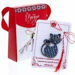 - Broșă Mărțișor Gentuță Pisicuță cu Inimioară, șnur Marțișor alb-roșu, ambalată în cutie tip gentuță, pregătită cu grijă pentru a fi oferită drept simbol al tradiției și al frumuseții primăverii.