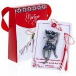 - Broșă Mărțișor Gentuță Pisicuță cu Pietricele Albastre, șnur Marțișor alb-roșu, ambalată în cutie tip gentuță, pregătită cu grijă pentru a fi oferită drept simbol al tradiției și al frumuseții primăverii.