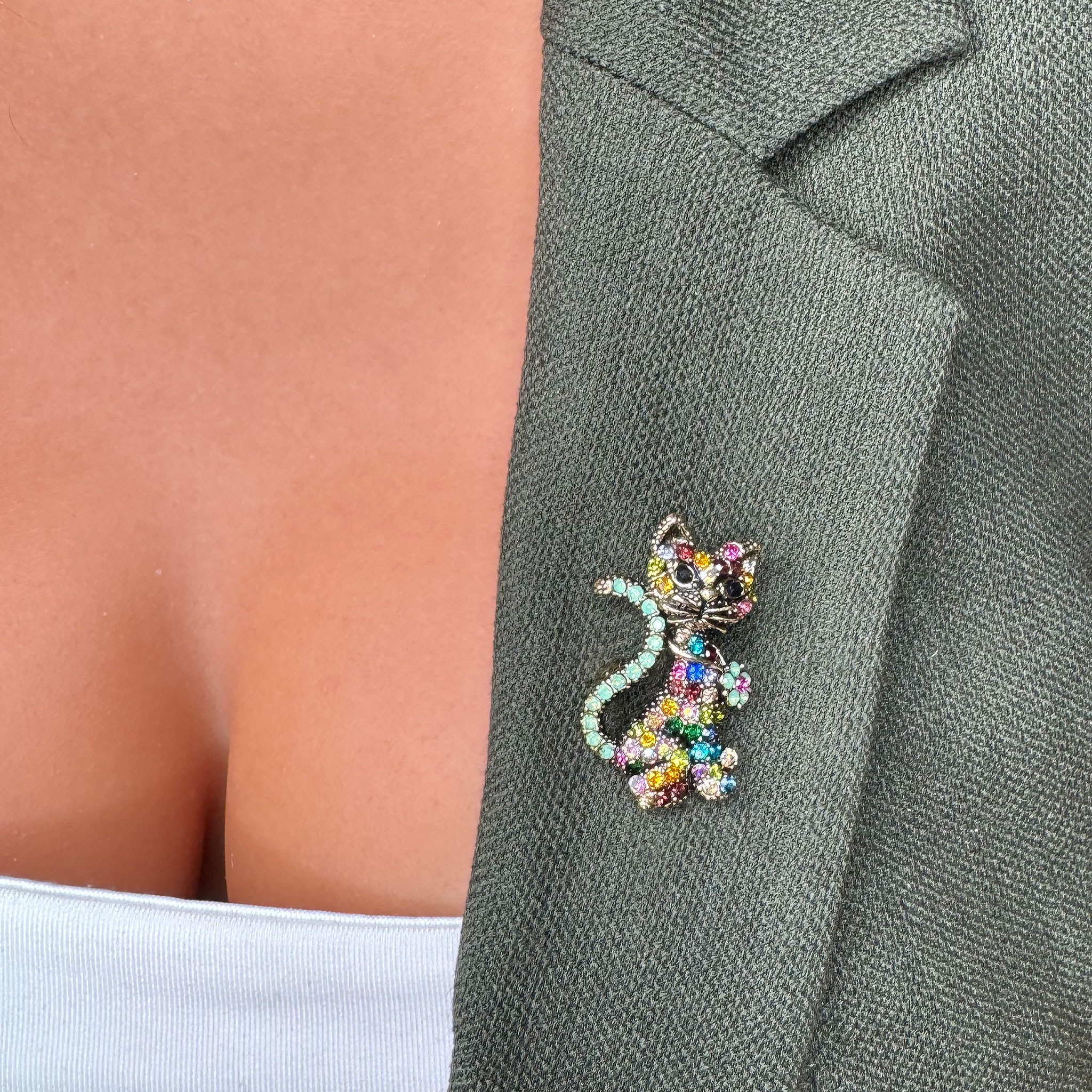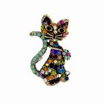 - Design: Broșa este realizată sub forma unei pisicuțe stilizate, decorată cu pietricele multicolore care captează lumina și creează un efect vizual vesel și elegant.