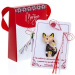 - Broșă Mărțișor Gentuță Pisicuță Zâmbitoare, șnur Marțișor alb-roșu, ambalată în cutie tip gentuță, pregătită cu grijă pentru a fi oferită drept simbol al tradiției și al frumuseții primăverii.