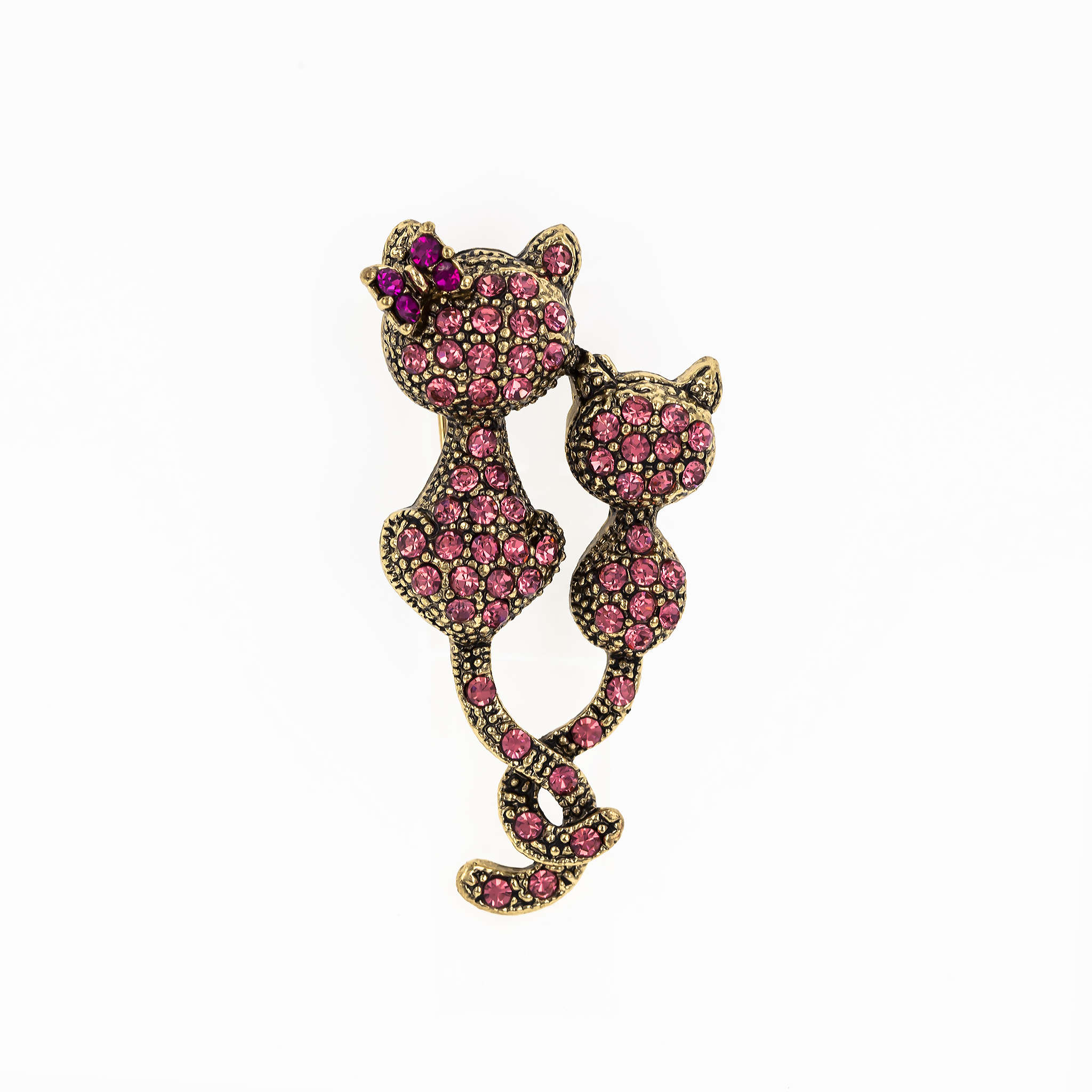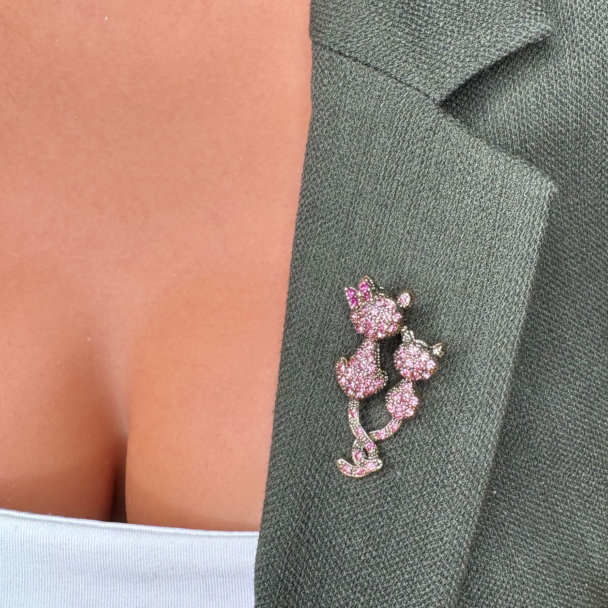 - Design: Realizată sub forma a două pisicuțe delicate, cu fundiță roz, broșa emană căldură și tandrețe. Culoarea roz aduce un plus de feminitate și un aer romantic acestei bijuterii.