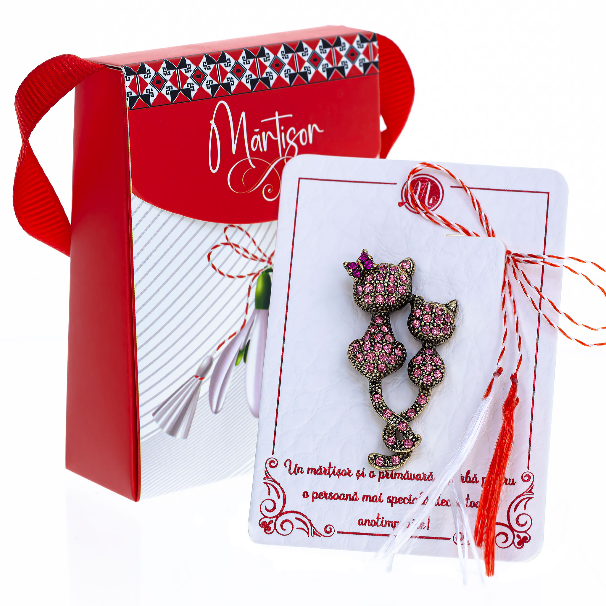 - Broșă Mărțișor Gentuță Pisicuțe cu Fundiță Roz, șnur Marțișor alb-roșu, ambalată în cutie tip gentuță, pregătită cu grijă pentru a fi oferită drept simbol al tradiției și al frumuseții primăverii.