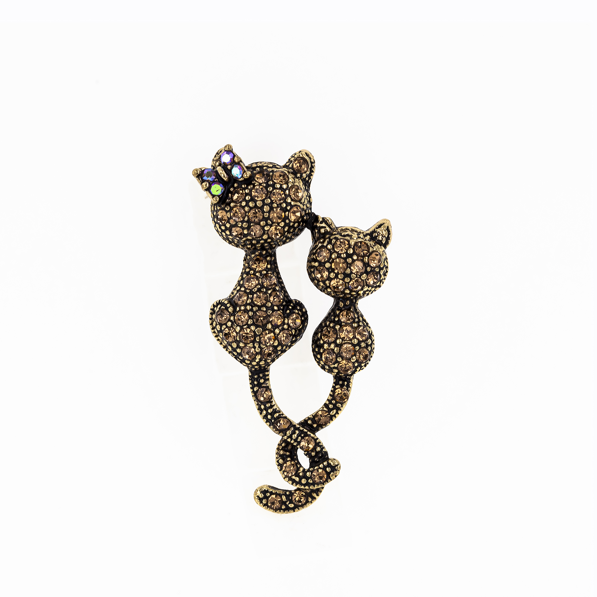 - Design: Creată sub forma a două pisicuțe stilizate, decorate cu o fundiță strălucitoare, broșa atrage privirile prin detalii fine și reflexii elegante, oferind un efect vizual modern și sofisticat.