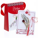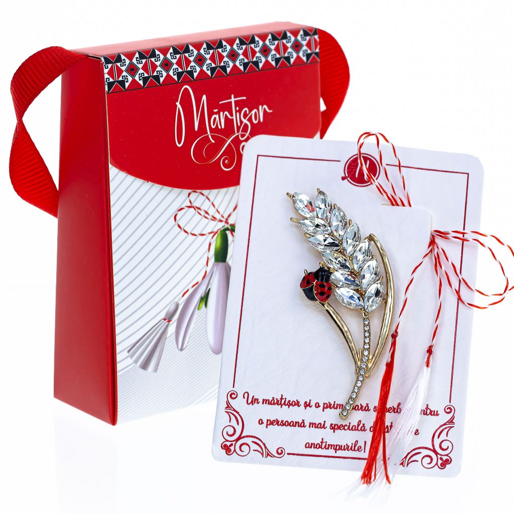 - Broșă Mărțișor Gentuță Spic Auriu cu Buburuză, șnur Marțișor alb-roșu, ambalată în cutie tip gentuță, pregătită cu grijă pentru a fi oferită ca un cadou special, simbol al tradiției.