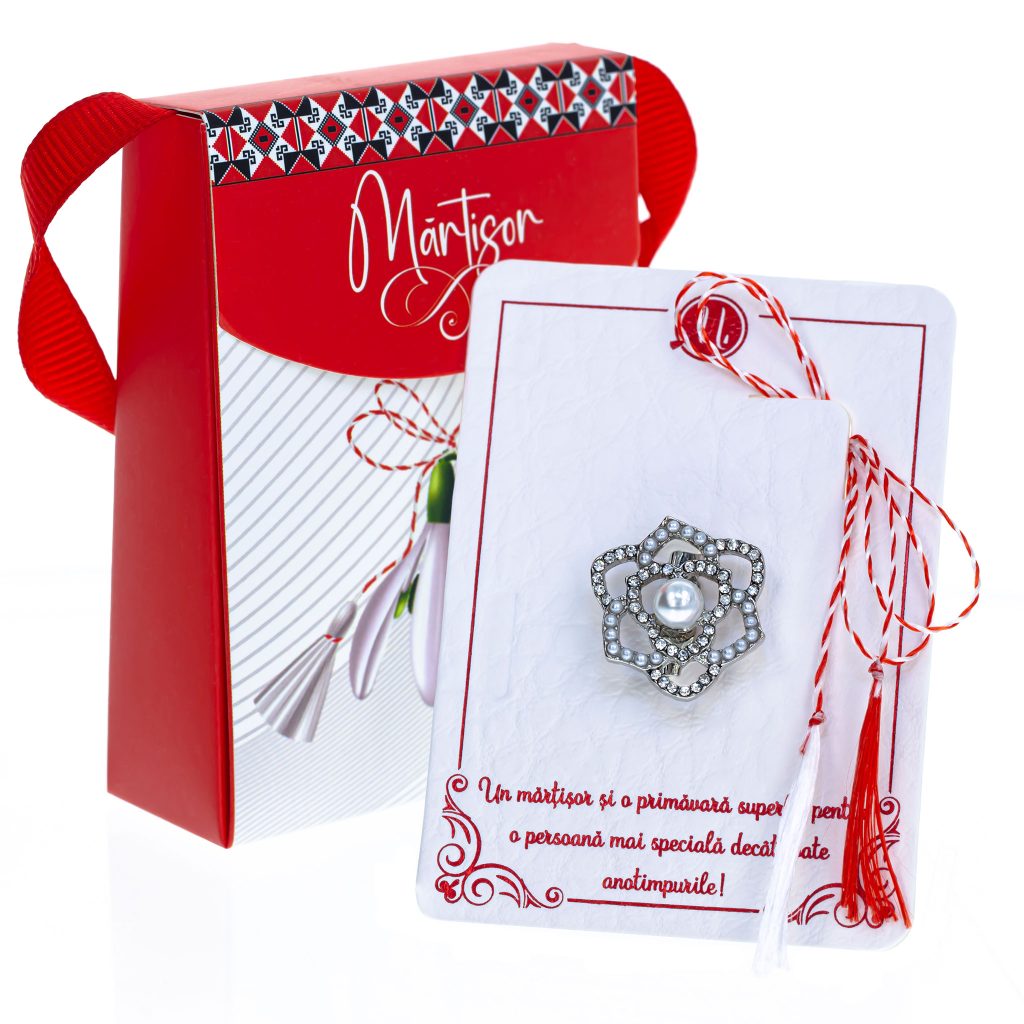 - Broșă Mărțișor Gentuță Trandafir Înflorit Argintiu, șnur Marțișor alb-roșu, ambalată în cutie tip gentuță, pregătită cu grijă pentru a fi oferită ca un cadou special, simbol al tradiției.