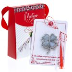 - Broșă Mărțișor Gentuță Trifoi Argintiu cu Petale Inimioare, șnur Marțișor alb-roșu, ambalată în cutie tip gentuță, pregătită cu grijă pentru a fi oferită ca un cadou special, simbol al tradiției.