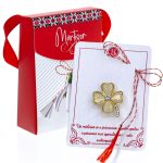 - Broșă Mărțișor Gentuță Trifoi Auriu, șnur Marțișor alb-roșu, ambalată în cutie tip gentuță, pregătită cu grijă pentru a fi oferită ca un cadou special, simbol al tradiției.