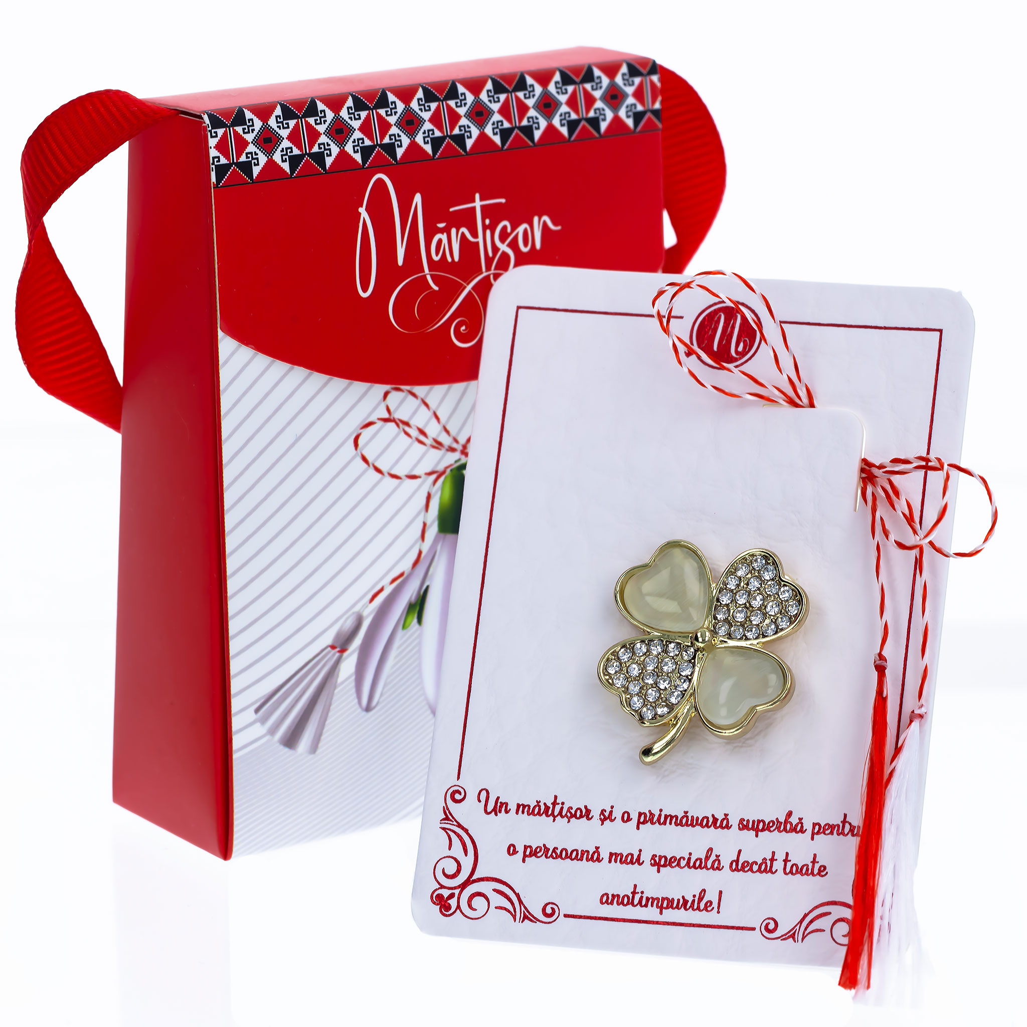 - Broșă Mărțișor Gentuță Trifoi, șnur Marțișor alb-roșu, ambalată în cutie tip gentuță, pregătită cu grijă pentru a fi oferită drept simbol al tradiției și al frumuseții primăverii.