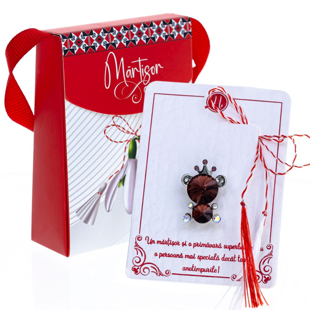 - Broșă Mărțișor Gentuță Ursuleț Argintiu cu Coroniță, șnur Marțișor alb-roșu, ambalată în cutie tip gentuță, pregătită cu grijă pentru a fi oferită ca un cadou special, simbol al tradiției.