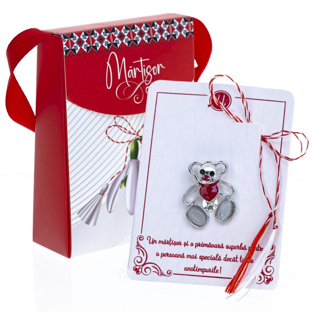 - Broșă Mărțișor Gentuță Ursuleț Argintiu cu Inimioară, șnur Marțișor alb-roșu, ambalată în cutie tip gentuță, pregătită cu grijă pentru a fi oferită ca un cadou special, simbol al tradiției.
