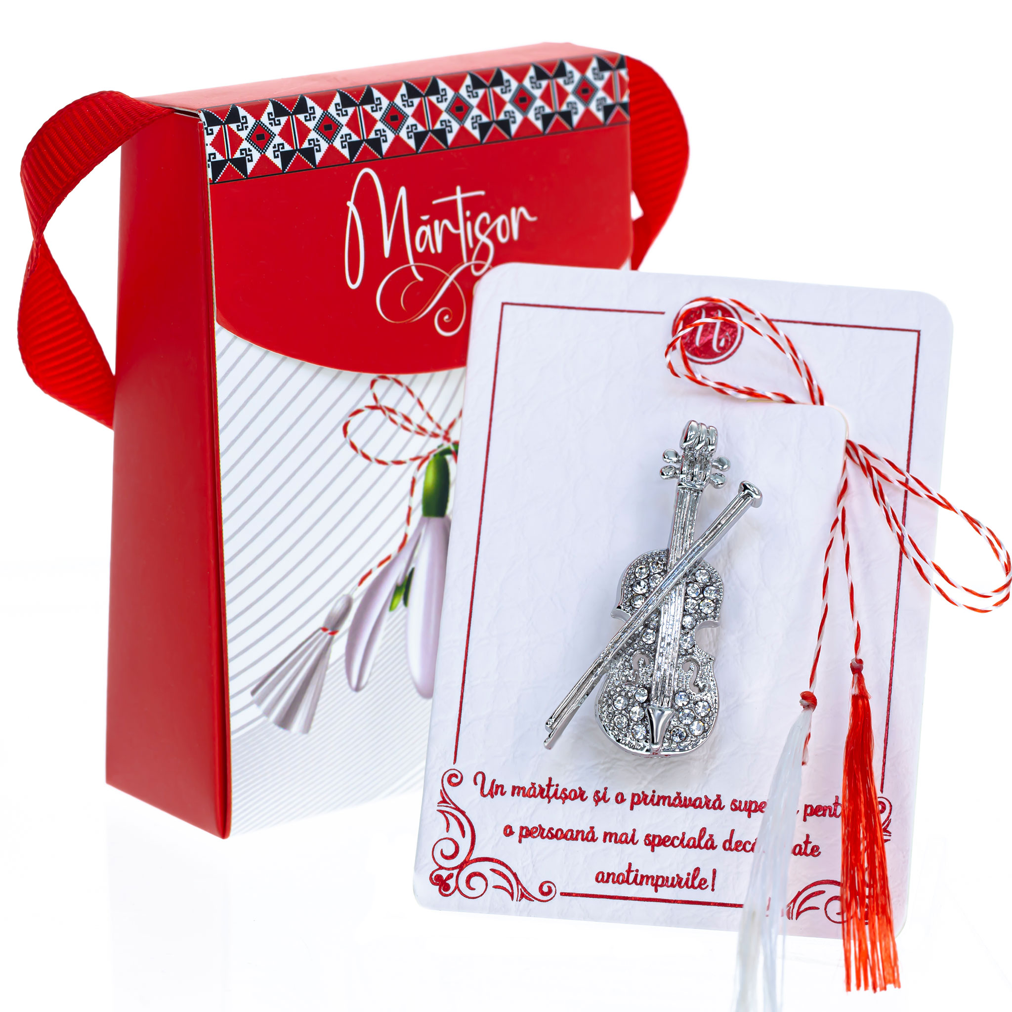 - Broșă Mărțișor Gentuță Vioară Argintie, șnur Marțișor alb-roșu, ambalată în cutie tip gentuță, pregătită cu grijă pentru a fi oferită drept simbol al tradiției și al frumuseții primăverii.