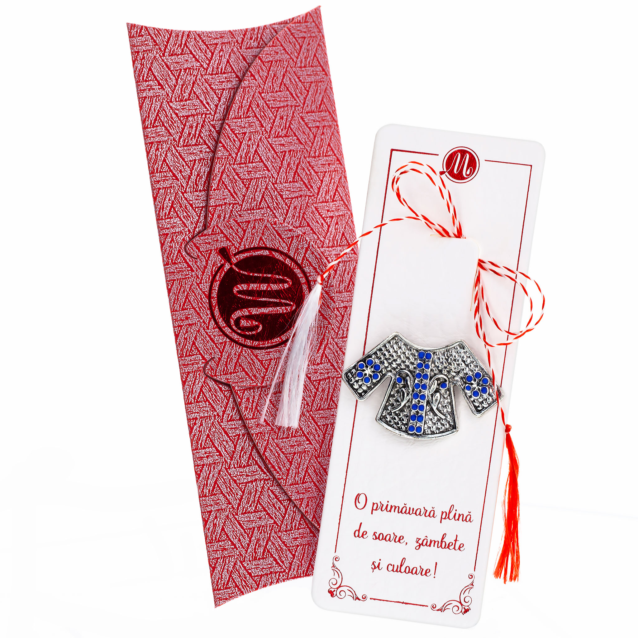- Broșă Mărțișor Motive Tradiționale, șnur Marțișor alb-roșu, însoțită de suport pentru broșă și plic, pregătită cu grijă pentru a fi oferită ca un cadou special, simbol al tradiției.