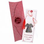 - Broșă Mărțișor Motive Tradiționale, șnur Marțișor alb-roșu, însoțită de suport pentru broșă și plic, pregătită cu grijă pentru a fi oferită ca un cadou special, simbol al tradiției.