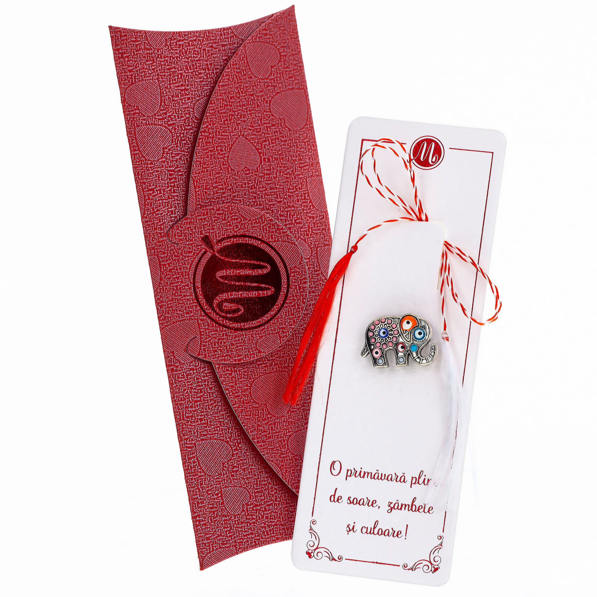 - Broșă Mărțișor Zalia Elefant, șnur Marțișor alb-roșu, însoțită de plic, pregătită cu grijă pentru a fi oferită ca un cadou special, simbol al tradiției.