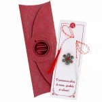 - Broșă Mărțișor Zalia Floricică, șnur Marțișor alb-roșu, însoțită de plic tip felicitare, pregătită cu grijă pentru a fi oferită ca un cadou special, simbol al tradiției.