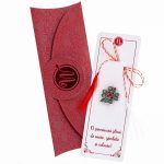 - Broșă Mărțișor Zalia Trifoi, șnur Marțișor alb-roșu, însoțită de plic tip felicitare, pregătită cu grijă pentru a fi oferită ca un cadou special, simbol al tradiției.