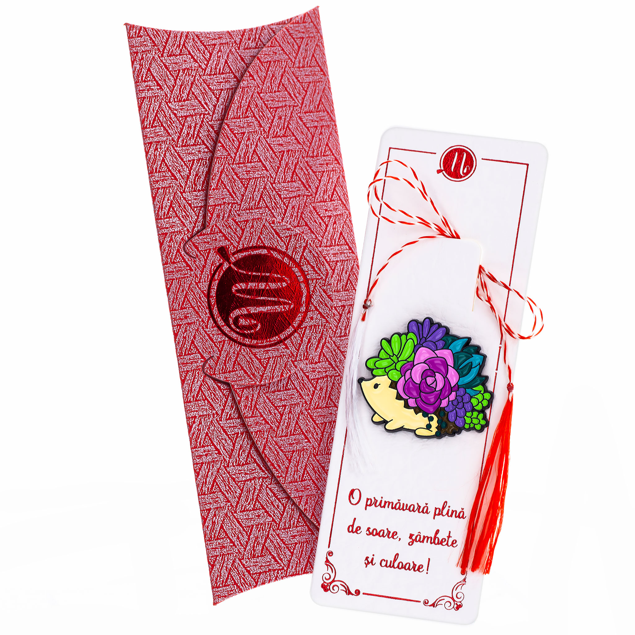 - Broșă Pin Happy – Model Arici cu Flori, șnur Marțișor alb-roșu, însoțită de suport pentru broșă și plic, pregătită să adauge un zâmbet fiecărei zile.