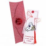 - Broșă Pin Happy – Model Cat and Wine, șnur Marțișor alb-roșu, însoțită de suport pentru broșă și plic, pregătită să adauge un zâmbet fiecărei zile.