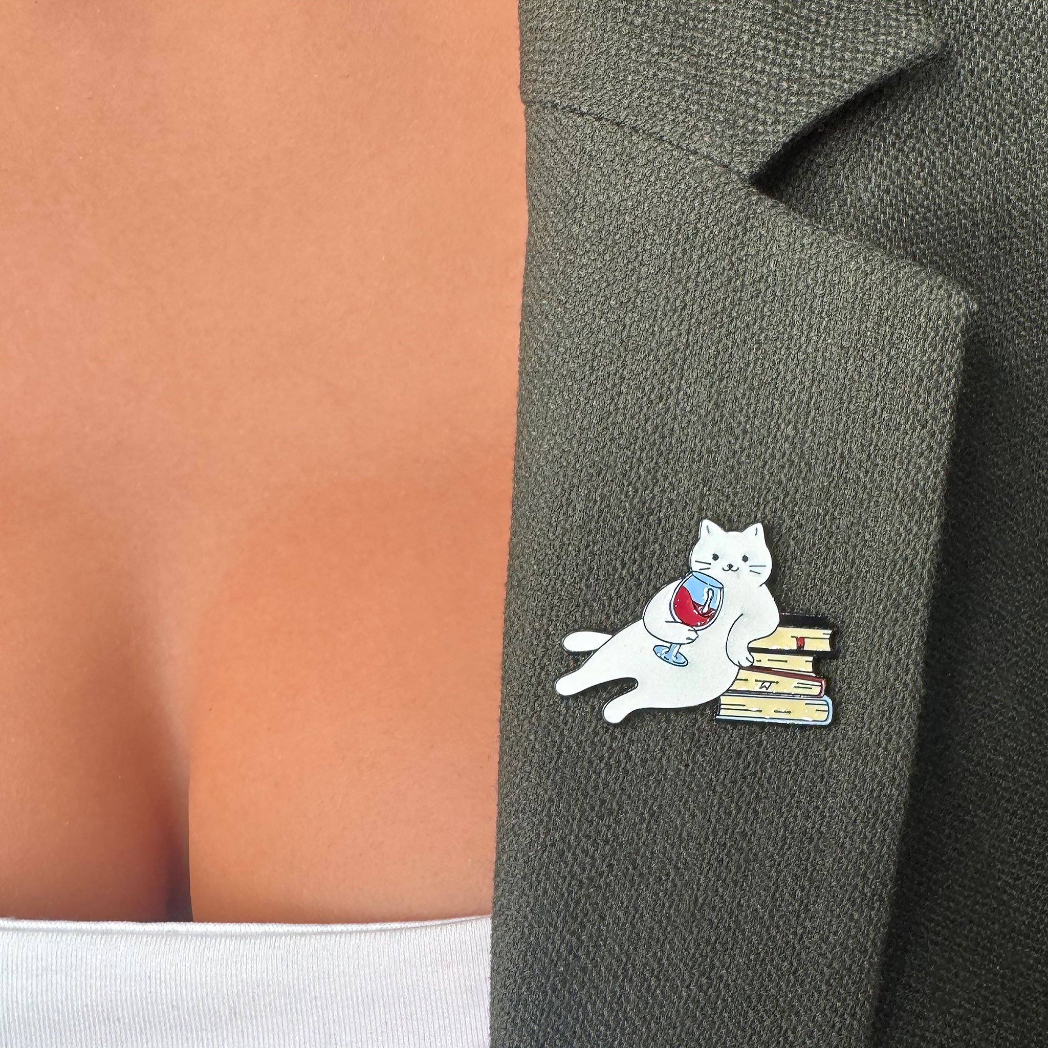 - Design: Detaliile pisicii, paharului și cărților sunt realizate cu atenție, creând un contrast vizual plăcut și o broșă ușor de integrat în ținute.