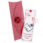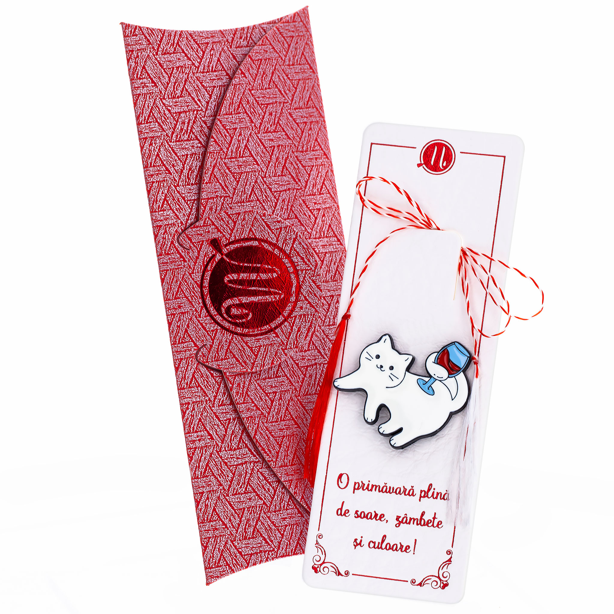 - Broșă Pin Happy – Model Cat, șnur Marțișor alb-roșu, însoțită de suport pentru broșă și plic, pregătită să adauge un zâmbet fiecărei zile.