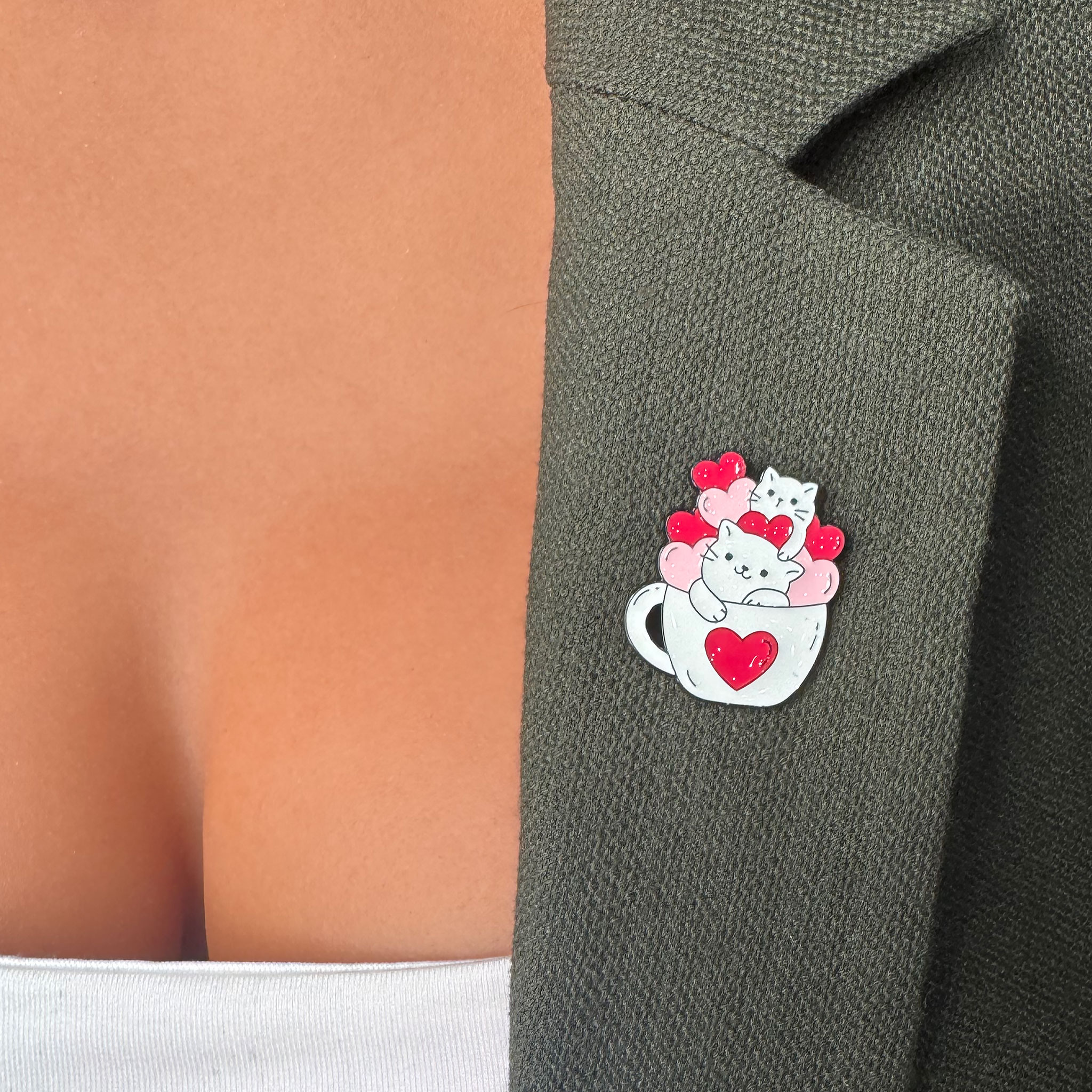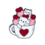 Această broșă tip pin surprinde într-un mod jucăuș și simpatic. Cele două pisicuțe înconjurate de inimioare roșii și roz, adaugă un detaliu vesel și plăcut ținutei.