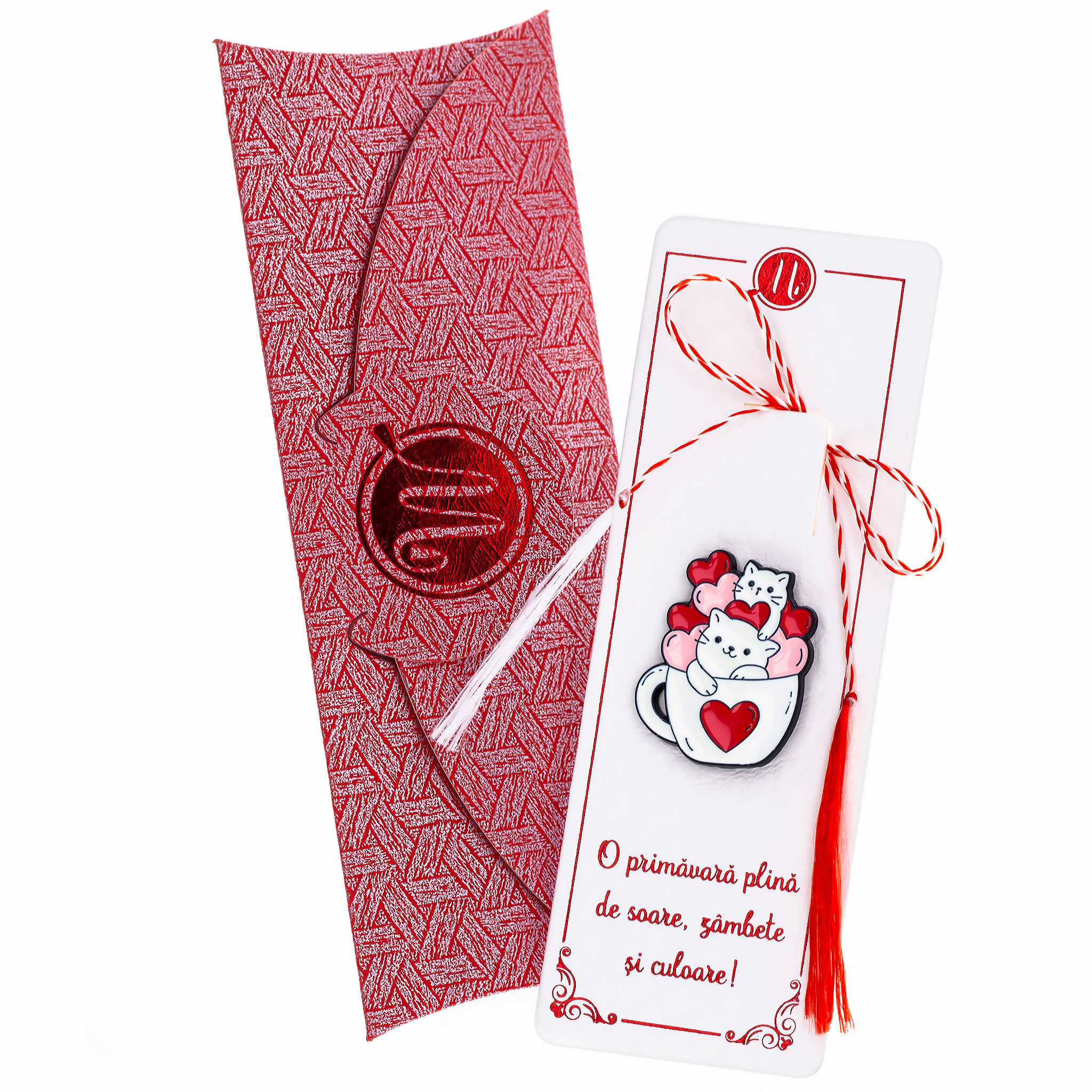 - Broșă Pin Happy – Model Cute Cats, șnur Marțișor alb-roșu, însoțită de suport pentru broșă și plic, pregătită să adauge un zâmbet fiecărei zile.