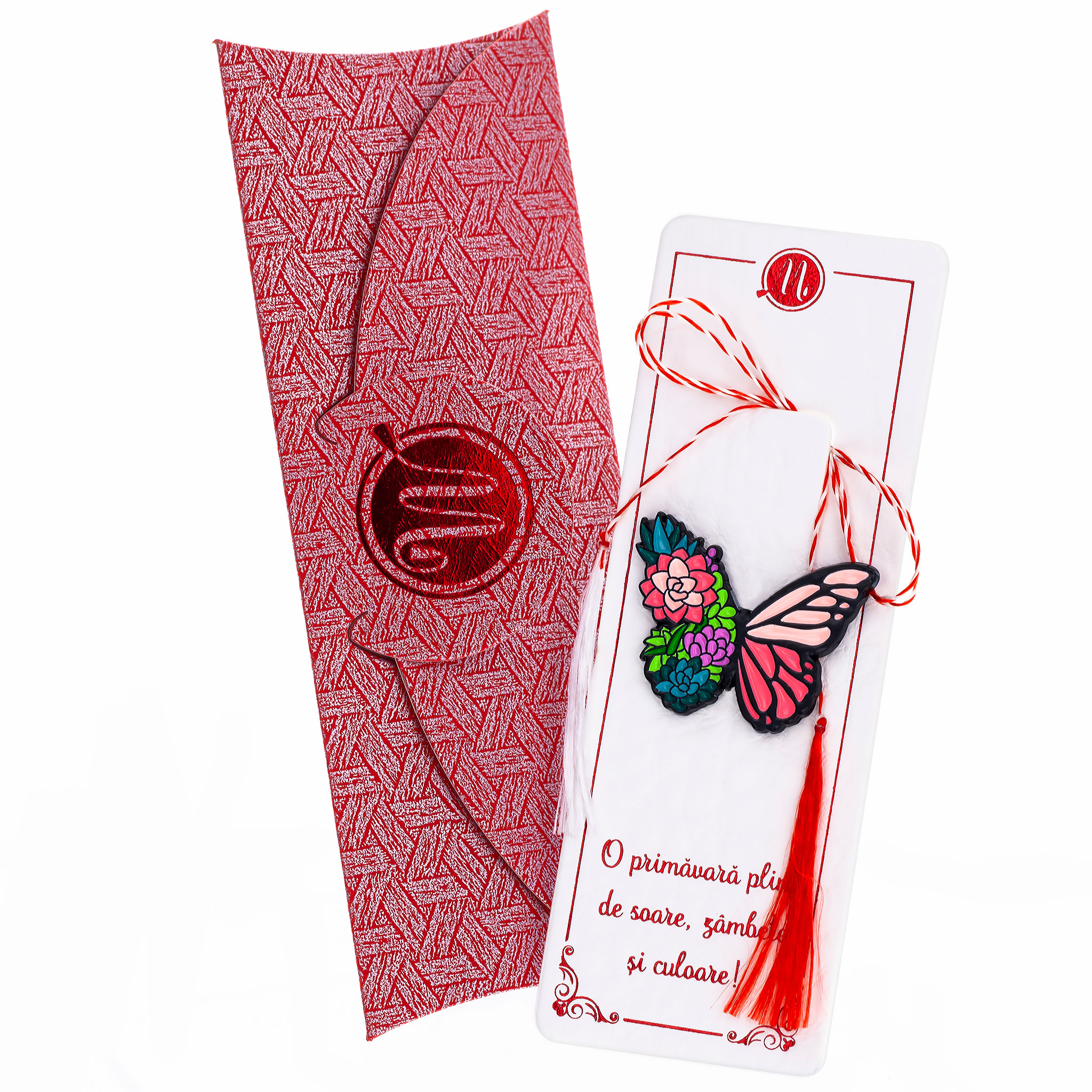 - Broșă Pin Happy – Model Fluturaș, șnur Marțișor alb-roșu, însoțită de suport pentru broșă și plic, pregătită să adauge un zâmbet fiecărei zile.