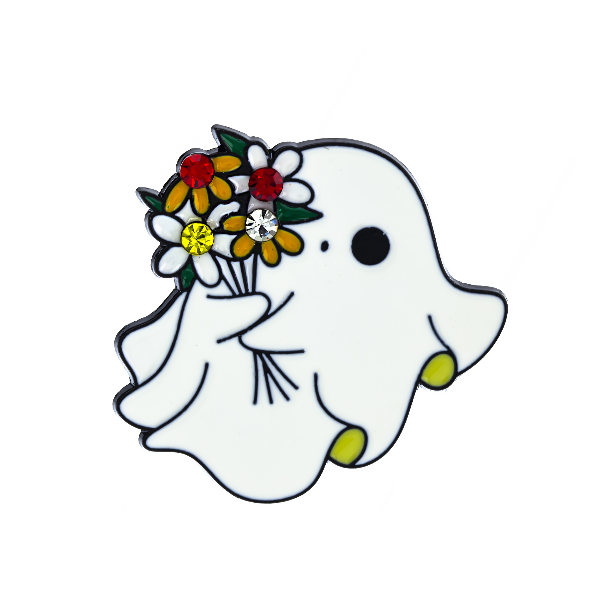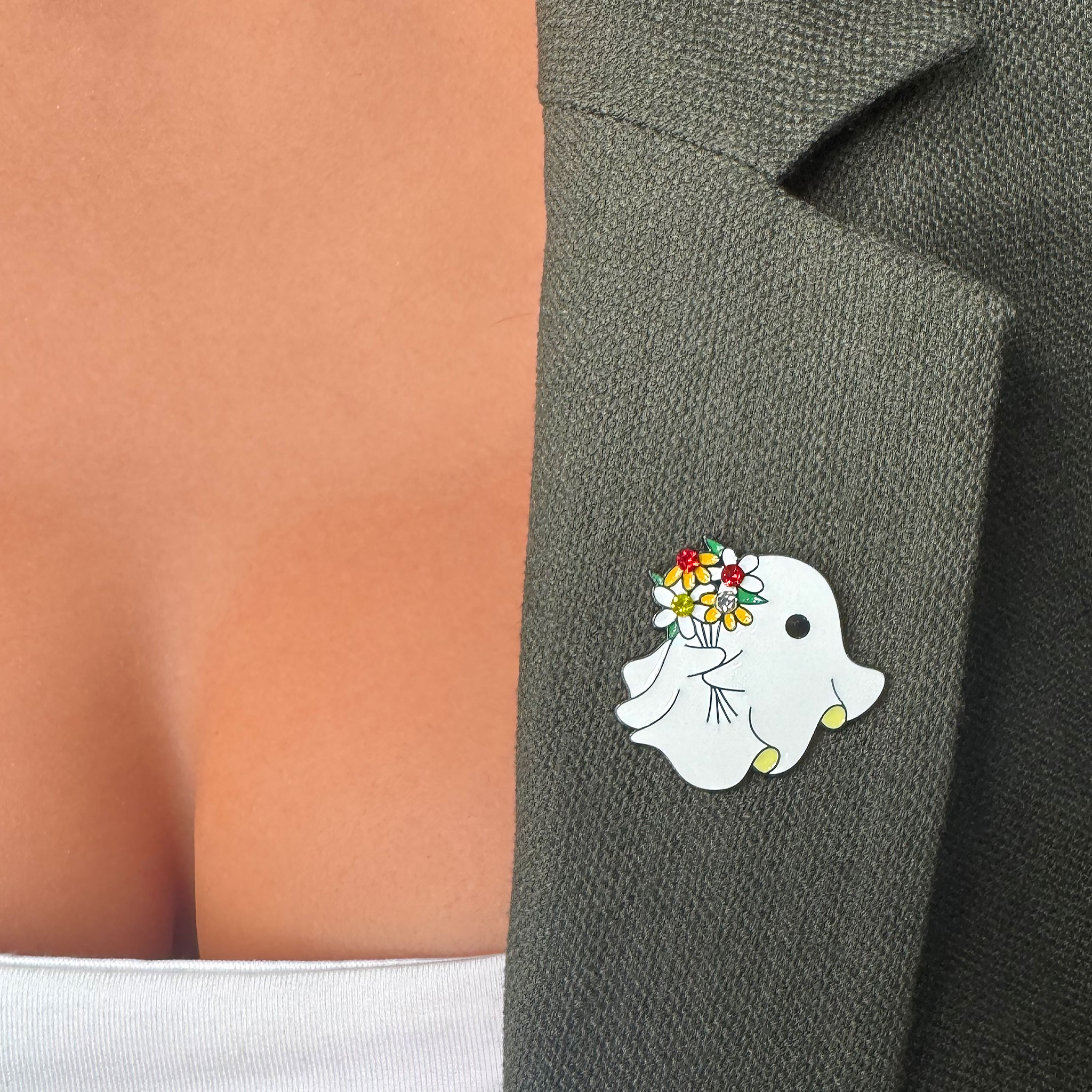 Această broșă tip pin combină simpatia cu un detaliu colorat și vesel. Fantomița ține un buchețel de flori în nuanțe vii, creând un accesoriu prietenos și ușor de purtat.
