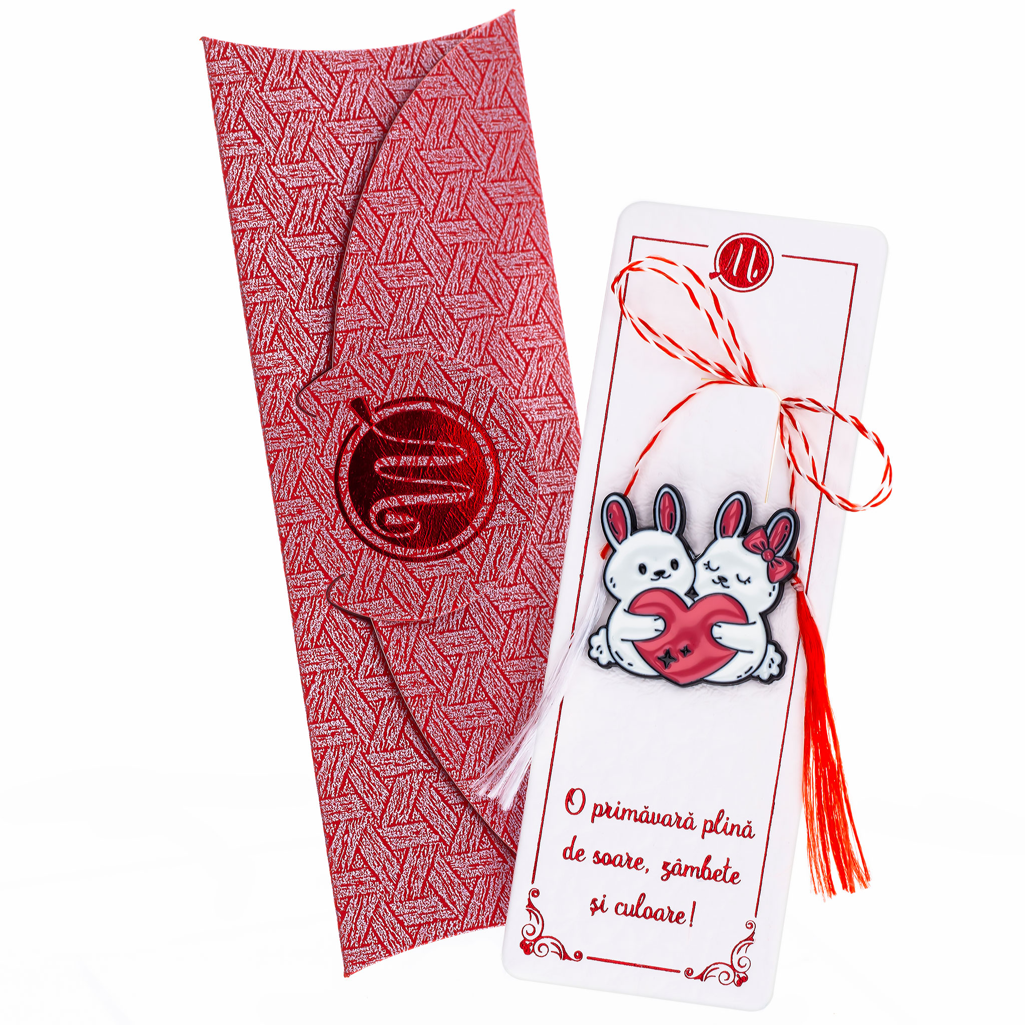 - Broșă Pin Happy – Model Iepurași, șnur Marțișor alb-roșu, însoțită de suport pentru broșă și plic, pregătită să adauge un zâmbet fiecărei zile.