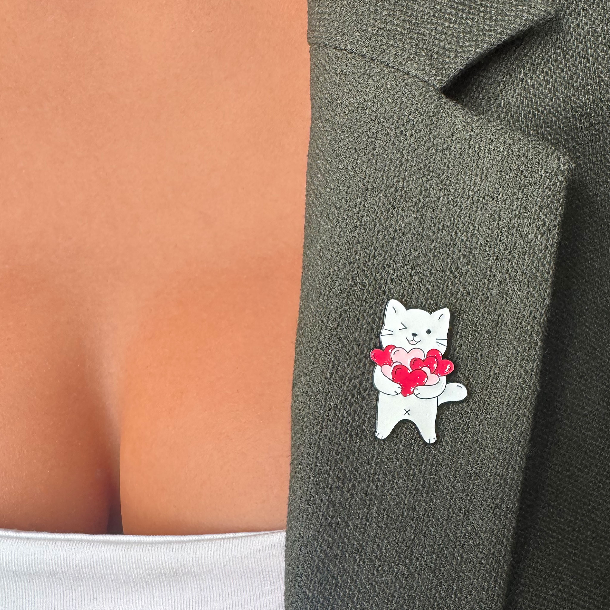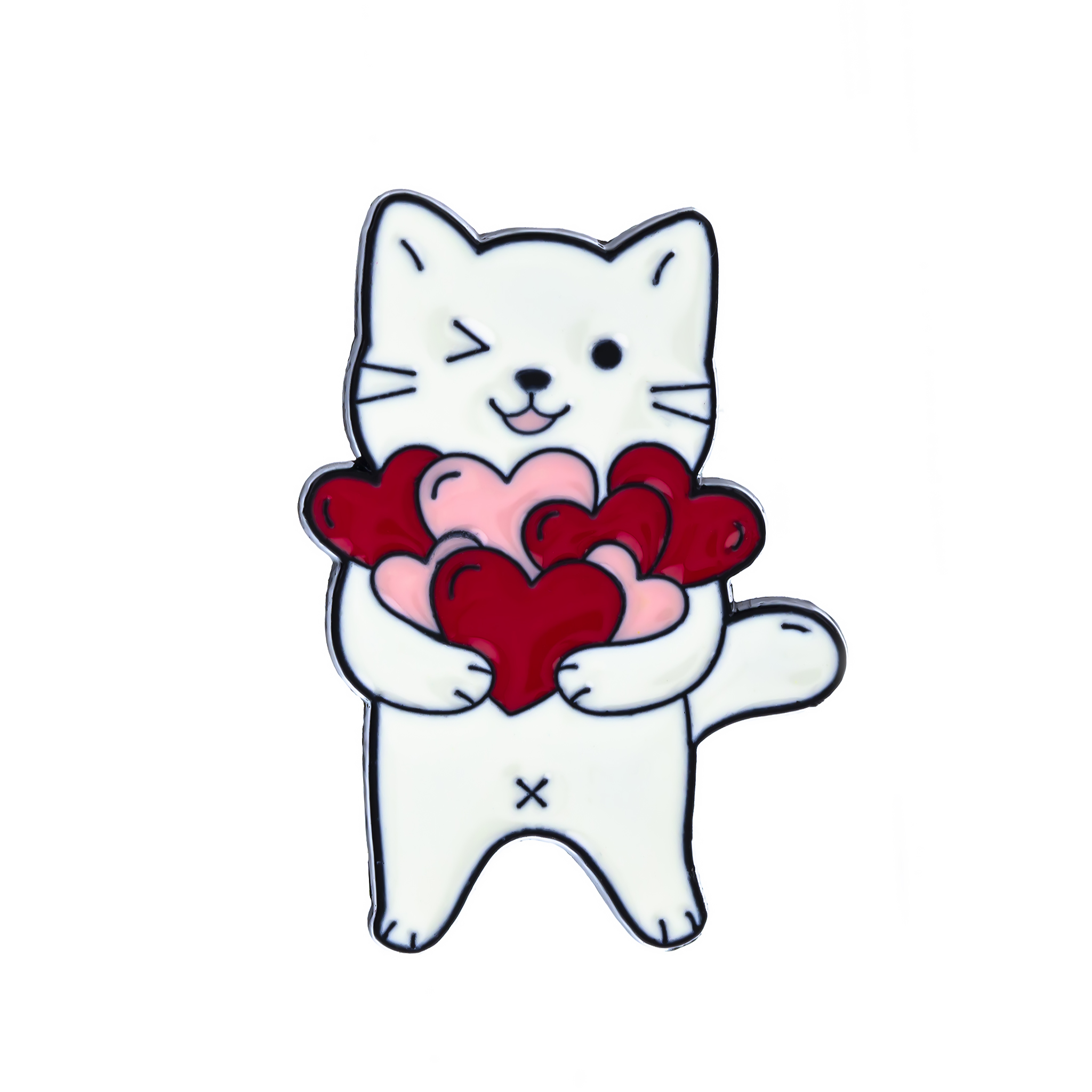 Această broșă tip pin adaugă un detaliu simpatic și jucăuș ținutelor tale. Pisica stilizată ține în brațe mai multe inimioare roz și roșii, creând un accesoriu vesel și plin de afecțiune.