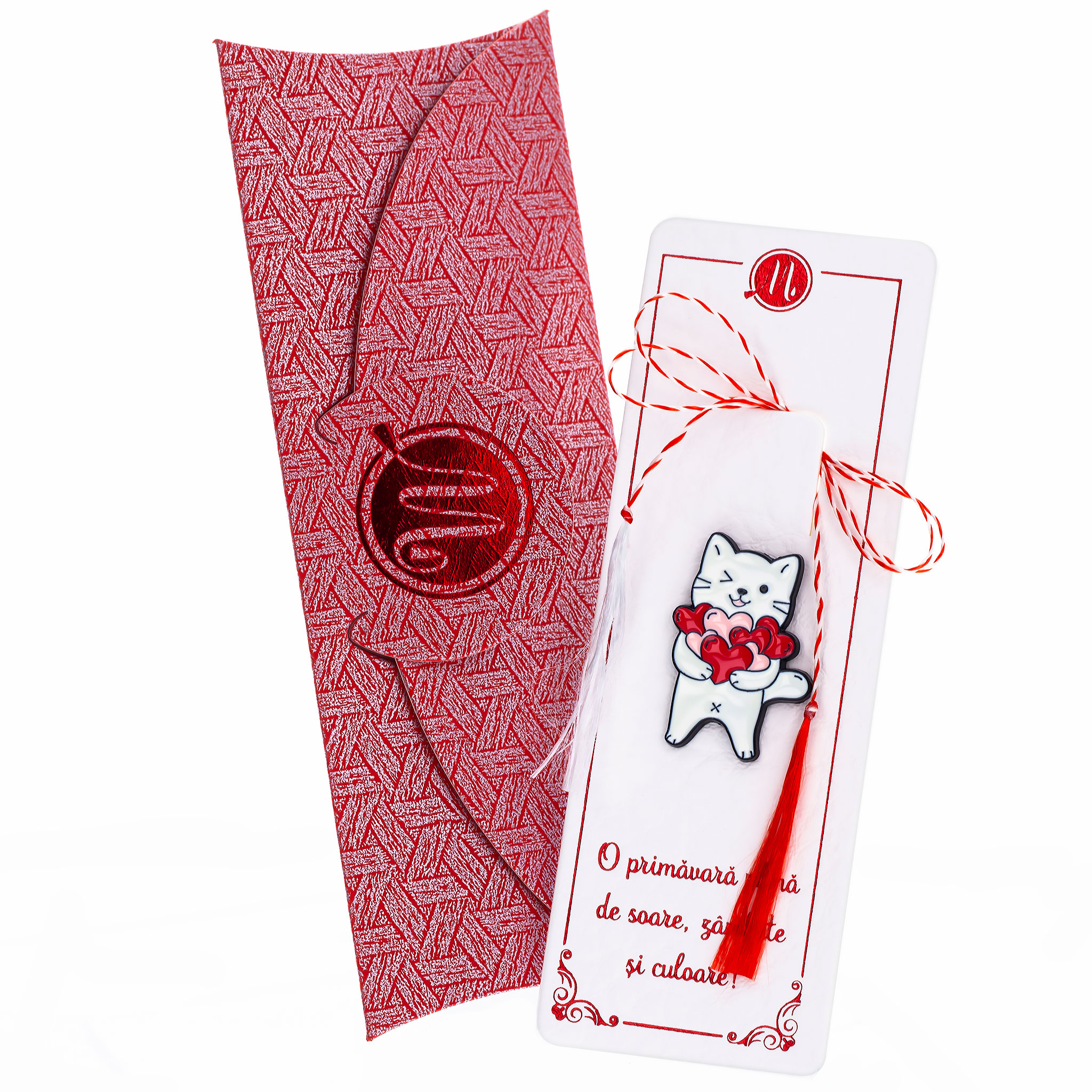 - Broșă Pin Happy – Model Love Cat, șnur Marțișor alb-roșu, însoțită de suport pentru broșă și plic, pregătită să adauge un zâmbet fiecărei zile.