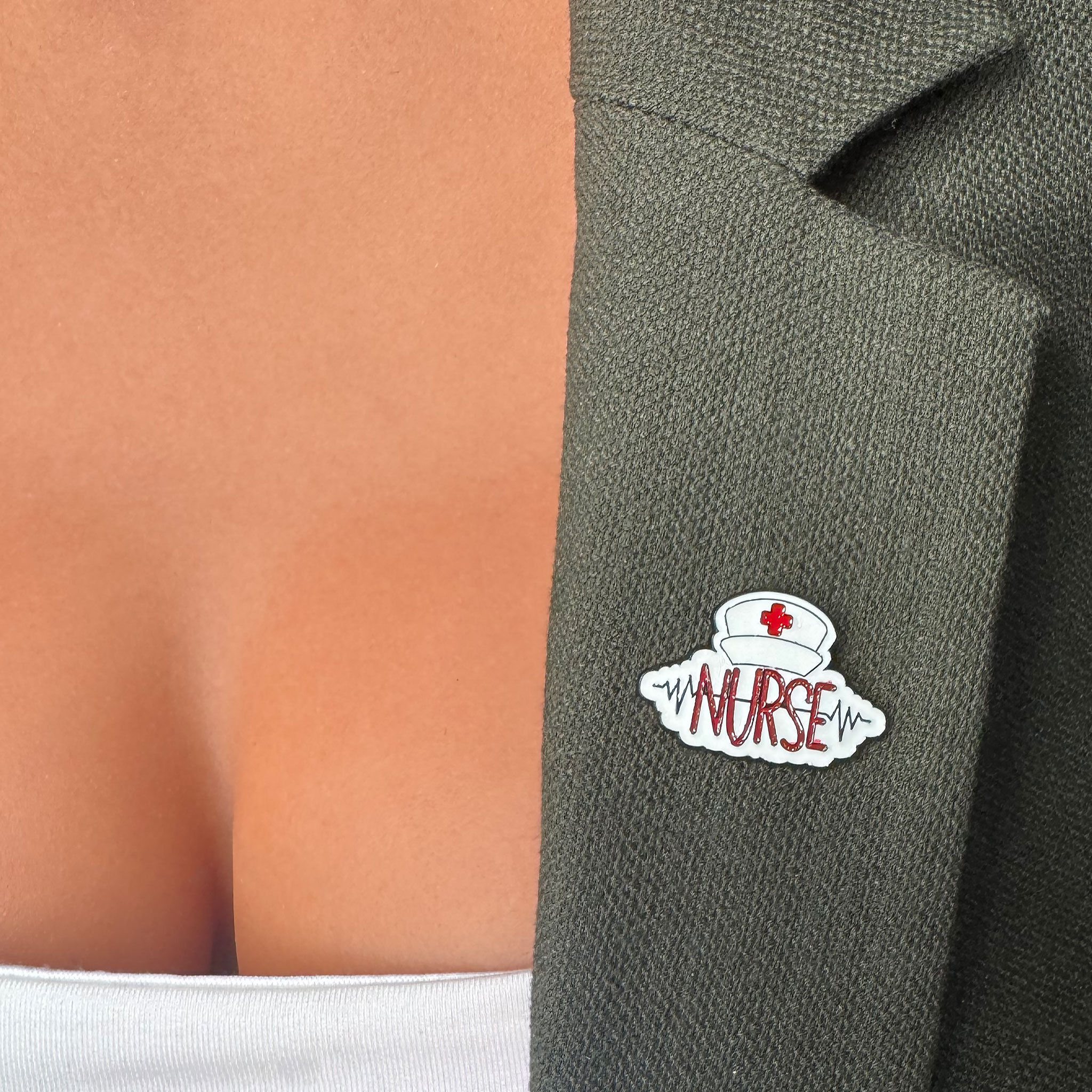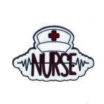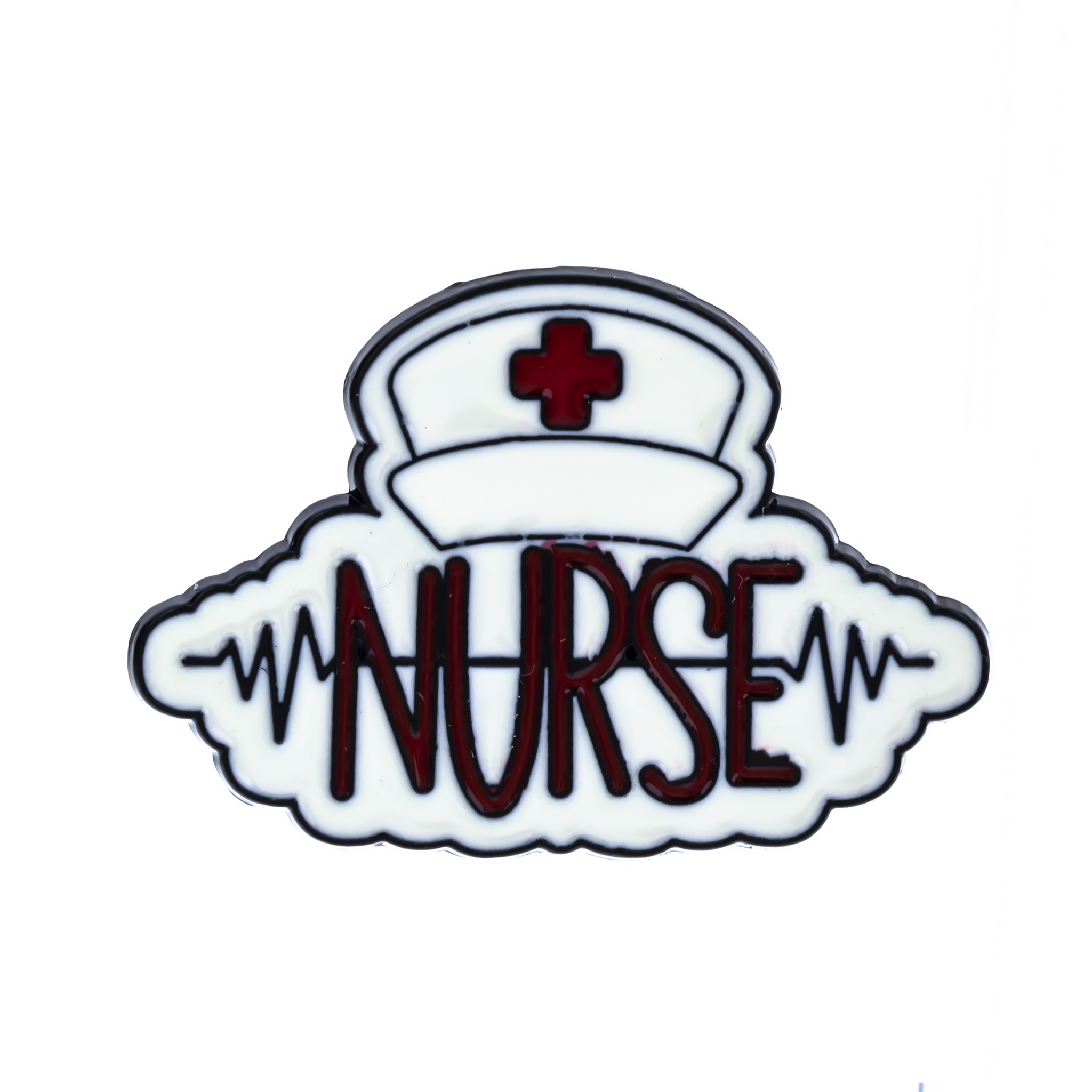 - Design: Broșa prezintă o bonetă de asistentă cu textul „NURSE” scris cu litere vizibile și clare. Fundalul alb face mesajul ușor de citit, iar forma compactă și finisajul neted conferă broșei un aspect modern.