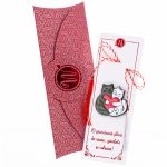 - Broșă Pin Happy – Model Pisicuțe, șnur Marțișor alb-roșu, însoțită de suport pentru broșă și plic, pregătită să adauge un zâmbet fiecărei zile.