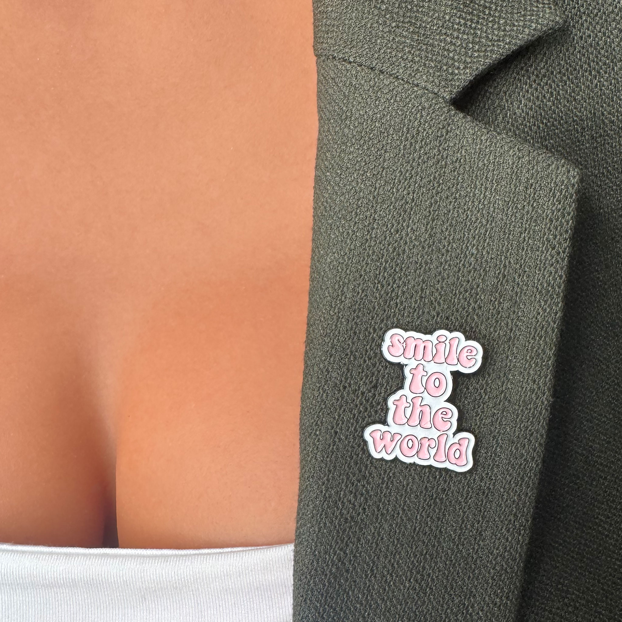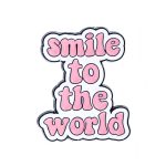 - Design: Broșa prezintă mesajul „Smile to the World” scris clar, cu un font prietenos și lizibil, pe un fundal alb care pune în valoare textul. Simplitatea designului îi conferă un aspect modern și ușor de asortat cu diverse stiluri vestimentare.