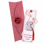 - Broșă Pin Happy – Model Smile, șnur Marțișor alb-roșu, însoțită de suport pentru broșă și plic, pregătită să adauge un zâmbet fiecărei zile.