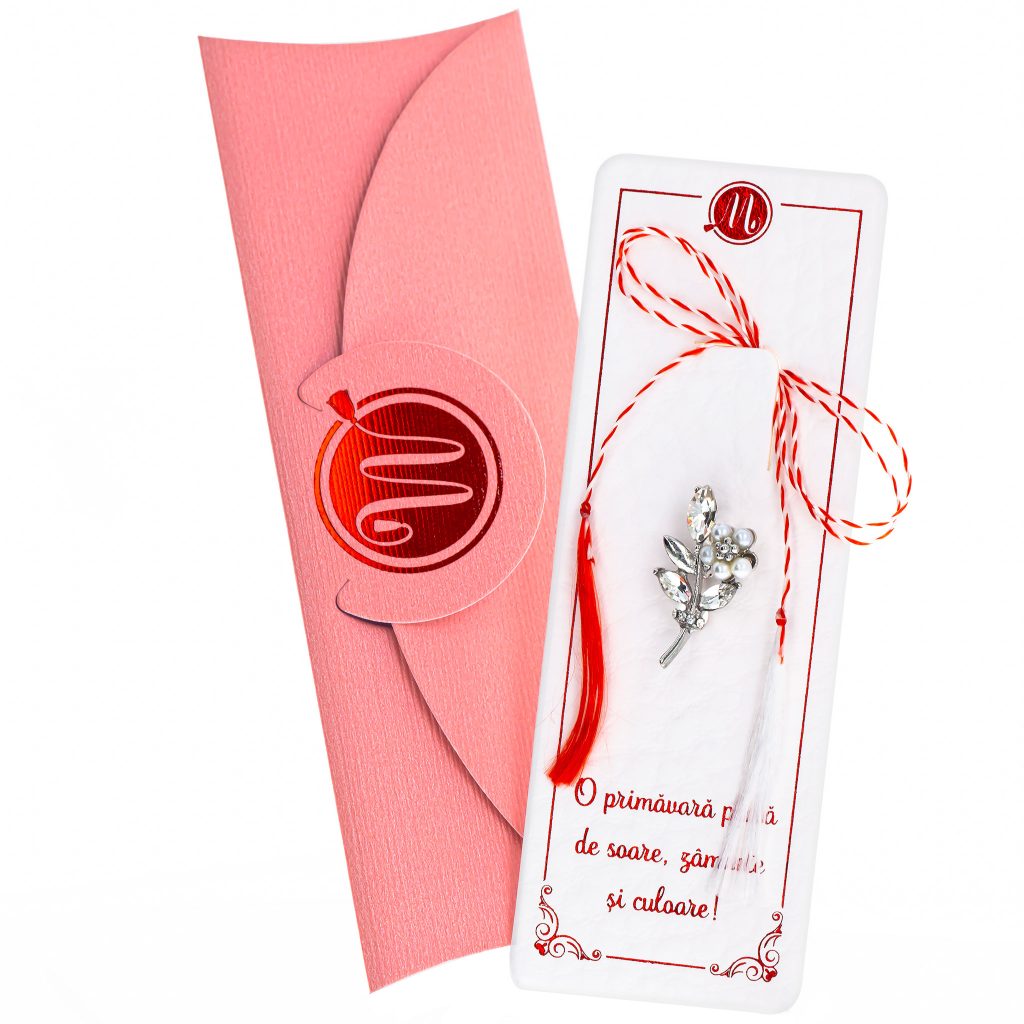 - Broșă Mărțișor Luna Floare Argintie cu Frunzulițe, șnur Marțișor alb-roșu, însoțită de suport pentru broșă, plic roz, pregătită cu grijă pentru a fi oferită ca un cadou special, simbol al tradiției.