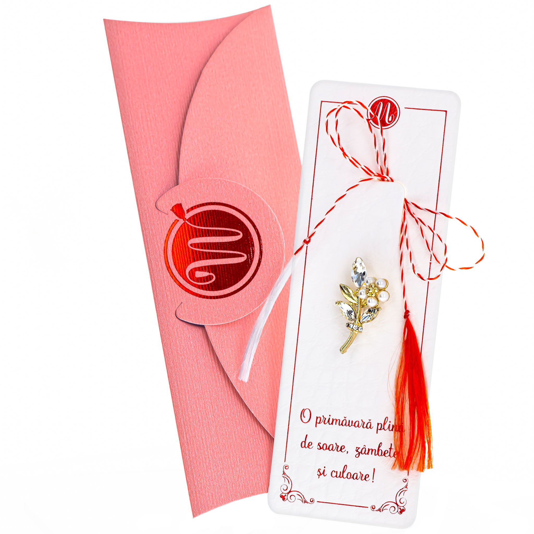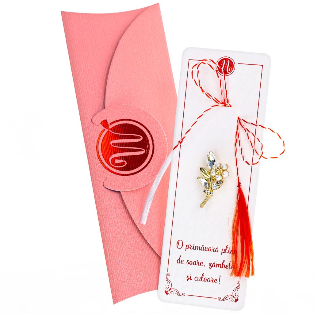 - Broșă Mărțișor Luna Floare Aurie cu Frunzulițe, șnur Marțișor alb-roșu, însoțită de suport pentru broșă, plic roz, pregătită cu grijă pentru a fi oferită ca un cadou special, simbol al tradiției.